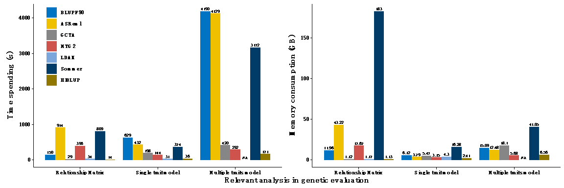 图3.HIBLUP新工具与国外现有工具计算时间及内存消耗对比。测试数据集的群体大小为10000,多性状模型中性状个数为2,均采用32线程并行运算,统一采用GBLUP模型。NA表示对应软件未实现该功能模块。