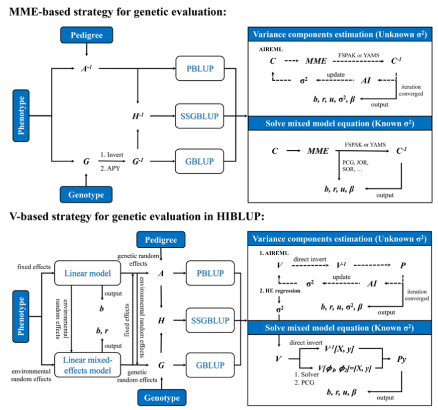遗传评估是育种的基础,随着基因组育种时代的来临,育种数据规模快速增长,评估算法的计算速度已成为育种中的关键限制因素。遗传评估主要包括方差组分估计及育种值求解两个步骤,其中方差组分估计的计算复杂度高,通常数月或一年更新一次;育种值求解复杂度相对较低,需要日常计算更新。目前,国际现有育种工具(如丹麦的DMU、美国的BLUPF90、英国的ASReml等)采用的评估算法都是以混合模型方程组(Mixedmodelequation, MME)为核心,即MME策略,需要求解个体关系矩阵和MME左手项(Lefthandside, LHS)的逆矩阵(如图2所示)。传统育种利用系谱构建个体亲缘关系矩阵,评估过程涉及的矩阵极其稀疏,FSPAK算法(美国专利)能够以极快速度求解稀疏矩阵LHS的逆矩阵,是基于系谱信息的传统育种计算必不可少的核心程序。然而,随着基因组育种时代的来临,个体亲缘关系矩阵构建逐渐由系谱过渡到基因组信息,关系矩阵及LHS矩阵也相应由全稀疏转变为半稠密或全稠密,FSPAK算法并不适用于稠密矩阵运算,其劣势逐渐显现,虽然FSPAK团队针对性地做出了优化,例如,推出了能够自动鉴别稀疏及稠密块的FSPAK升级版“YAMS”,以及利用区分核心群和非核心群的方式近似求解基因组个体关系逆矩阵的“APY”策略等,一定程度上提升了数据处理能力,但仍然依赖MME框架,无法避免多次大矩阵的求逆运算,当基因分型个体规模累计到数十万时,MME策略面临计算效率低及内存需求大的双重问题,并不能适应基因组大数据时代的育种计算需求。为解决这一难题,HIBLUP首创基于方差协方差V矩阵的“HE+PCG”策略,即利用HE回归法估计方差组分,采用基于V矩阵的PCG迭代法估计育种值(如图2所示),可完全避免遗传评估计算过程中的大矩阵求逆,并且V矩阵的维度(有表型个体数)远低于MME方程的维度(所有个体数×遗传随机效应个数)。因此,无论是计算效率还是内存需求上,HIBLUP全面优于基于MME策略的现有工具,更适合基因组育种时代的大数据计算。