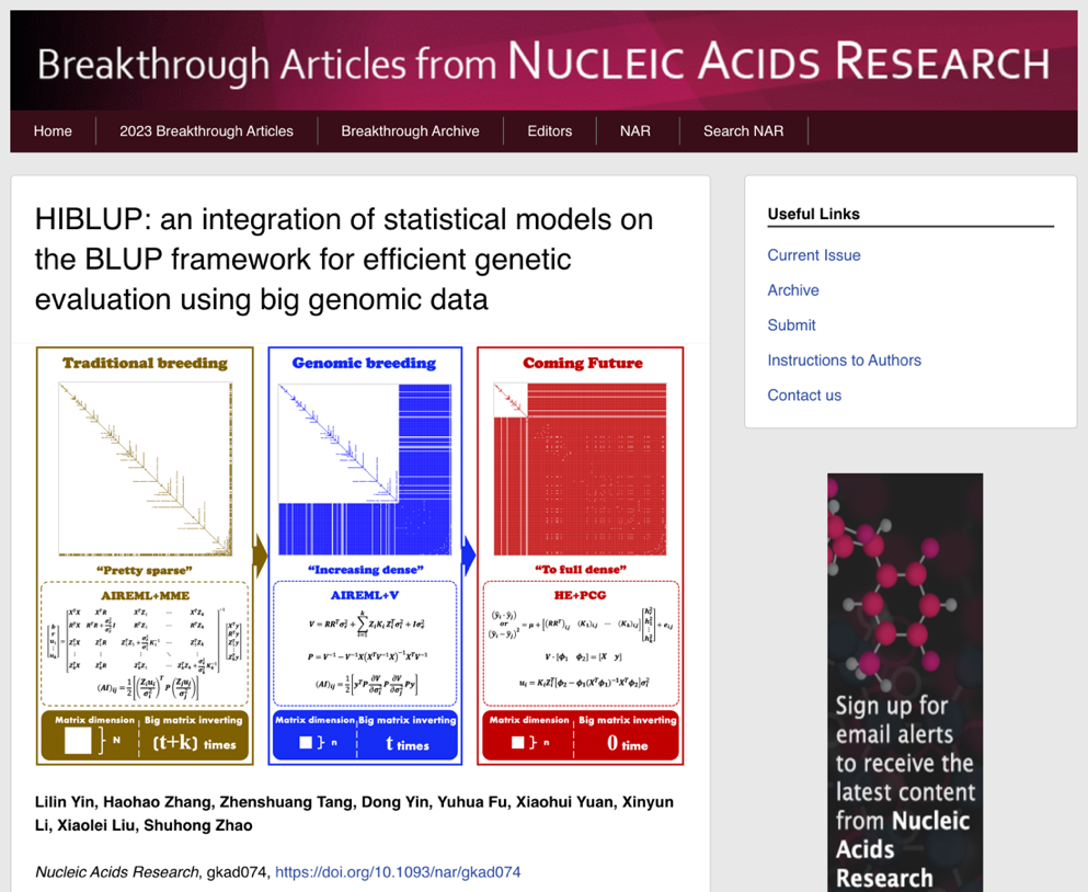 (通讯员:刘小磊、尹立林、张浩浩)核心提要:2023年2月22日,学院赵书红教授团队在《Nucleic Acids Research》期刊在线发表了题为“HIBLUP: An integration of statistical models on the BLUP framework for efficient genetic evaluation using big genomic data”的研究成果文章,被期刊评为“突破性进展”论文(BreakthroughArticle)。该研究提出了更适合基因组育种大数据计算的“HE+PCG”新策略,开发出高性能计算新工具HIBLUP,为开展基因组高效选种及精准选配研究和产业应用提供了国产化利器。