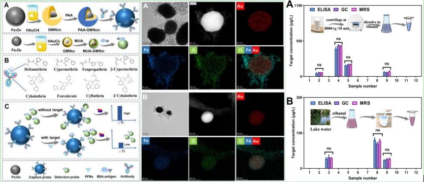 近日,我校王玉莲副教授课题组在 Journal of Hazardous Material(IF=14.224)发表了题为“Broad-spectrum portable magnetic relaxation switching immunosensor with gold-functionalized magnetic nanoprobes for the sensitive detection of multiple pyrethroids”的研究论文。该论文构建了一系列不同粒径的新型的金功能化、广谱MRS生物传感器,引入广谱抗体CL-CN/1D2作为识别元件,实现了对8种拟菊酯类农药(PYRs)的特异性识别(图左),提出新型的金功能化MRS传感器,与传统MRS相比,金功能化广谱MRS生物传感器具有更强的光学、磁性、催化性能和热稳定性,突破传统MRS免疫传感器检测光谱窄、疏水性分析物稳定性差的局限性。该传感器利用磁性纳米粒子和金纳米粒子的优势,在牛奶和湖水中,能够在35min内多次检测PYRs,具有高灵敏度和高稳定性。