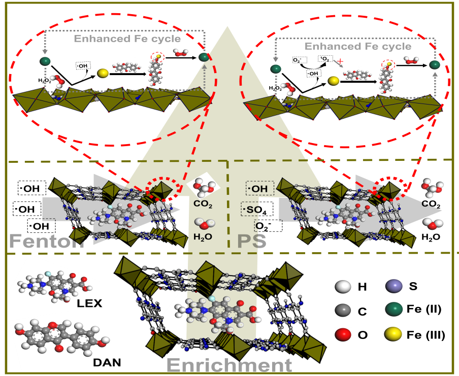 图1. Fe-MOF-DMIP在芬顿氧化和过硫酸盐氧化体系下的作用机制示意图