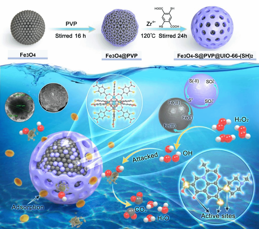 (通讯员 李定堂)近日,我校英国365集团精准兽药创制与环境消减技术开发团队设计了具有核壳结构和硫掺杂特征的多功能金属有机骨架材料,实现了对抗菌药物的高效吸附和协同降解。相关成果以“S-doped core-shell heterojunction Fenton catalyst (Fe3O4-S@PVP@UIO-66-(SH)2) for enhanced activation of hydroxyl radical: synergistic enrichment and degradation mechanism”为题发表在Chemical Engineering Journal上。本研究通过在四氧化三铁团簇内外同时生长巯基化锆基金属有机骨架,构建了具有高效吸附性和过氧化氢活化性能的多相芬顿催化纳米材料,同时结合理论计算与试验结果系统地探究了引入非金属克服铁活性位点失活的机制。