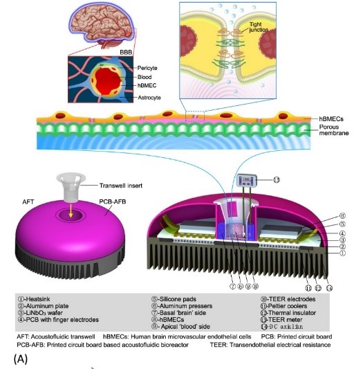 为了探究SAW是否可用于BBB的调控,研究团队合作开发了一种柔性印刷电路板的声流体生物反应器(PCB-AFB),用于BBB体外模型及斑马鱼模型的研究。利用欧姆计测定BBB体外模型的跨内皮电阻,及对各类分子的细胞旁通透性,分析BBB的功能。