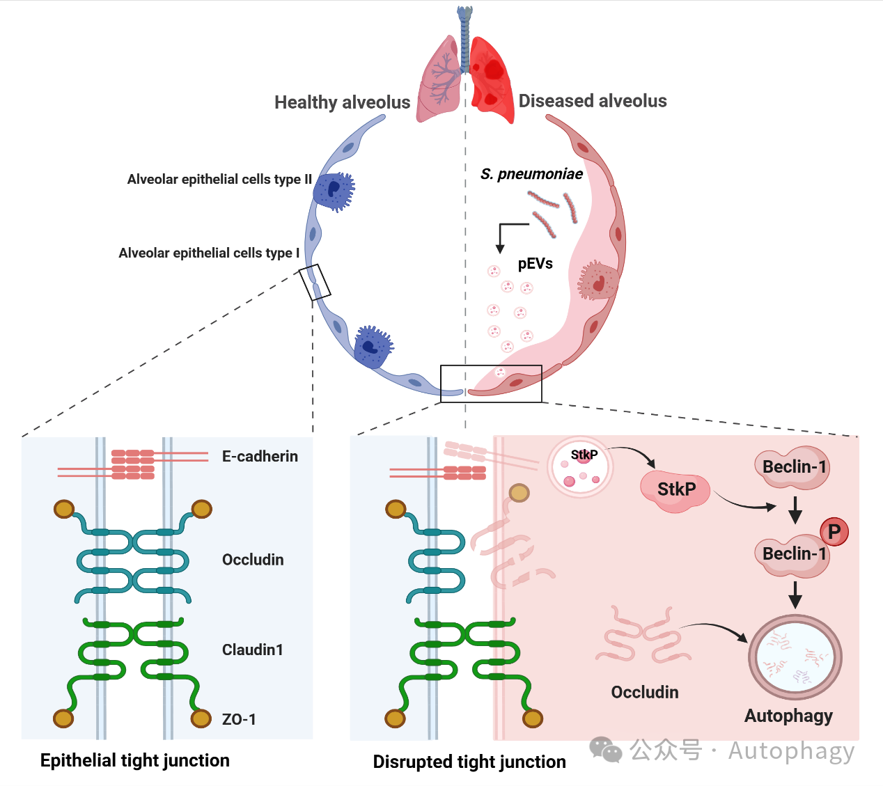 2024年3月18日,365英国上市公司英国365集团王湘如教授团队在国际权威期刊在《自噬(Autophagy)》杂志(2022 IF:13.3)发表题为“Streptococcus pneumoniaeextracellular vesicles aggravate alveolar epithelial barrier disruption via autophagic degradation of OCLN (occludin)”的研究论文。该研究发现在肺炎链球菌感染过程中,其胞外囊泡(pEVs)作为一种重要的运载工具,可递送细菌蛋白StkP至宿主细胞,通过劫持细胞自噬途径降解肺泡上皮细胞间紧密连接蛋白Occludin,导致肺泡上皮屏障功能的破坏。