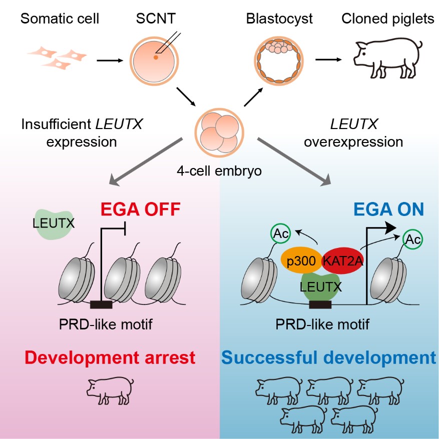 (通讯员:刘鑫、周凯)近日,我校苗义良教授领衔的动物克隆与干细胞研究团队在Cell Reports发表了题为“LEUTX regulates porcine embryonic genome activation in somatic cell nuclear transfer embryos”的最新研究成果。该研究全面系统地揭示了猪特异性转录因子LEUTX对体细胞重编程的调控机制,并为提高猪的克隆效率提供了新方法。