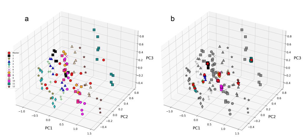 图3 样本PCA降维后的从属仪器校正前(a)和ACPDS后(b)光谱映射分布