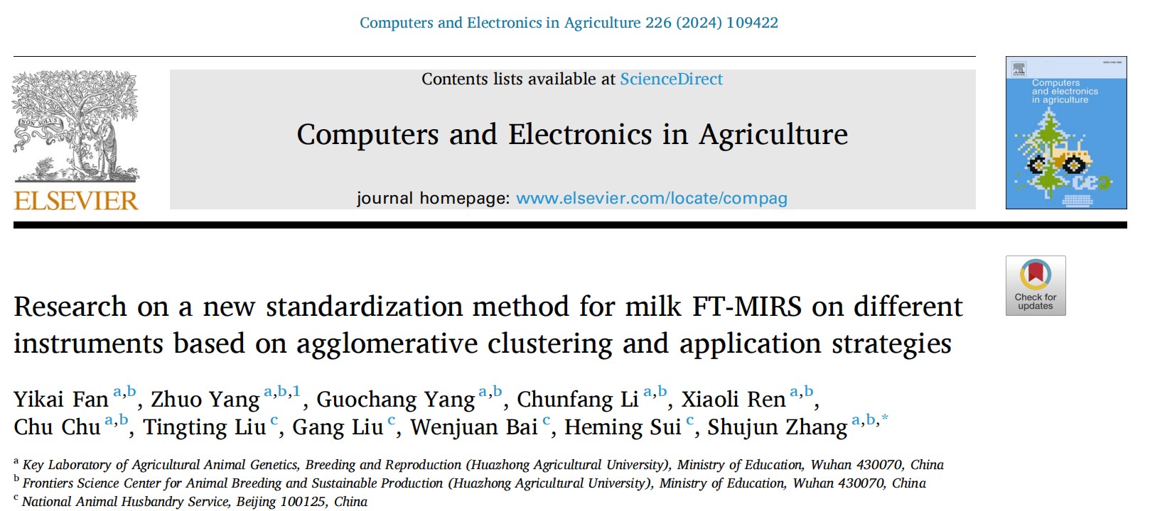 南湖新闻网讯(通讯员 樊懿楷)近日,我校英国365集团农业动物遗传育种与繁殖教育部重点实验室张淑君教授团队在牛奶中红外光谱仪器的标准化研究领域取得重要进展。相关成果以“Research on a New Standardization Method for Milk FT-MIRS on Different Instruments Based on Agglomerative Clustering and Application Strategies”为题在Computers and Electronics in Agriculture期刊上发表。