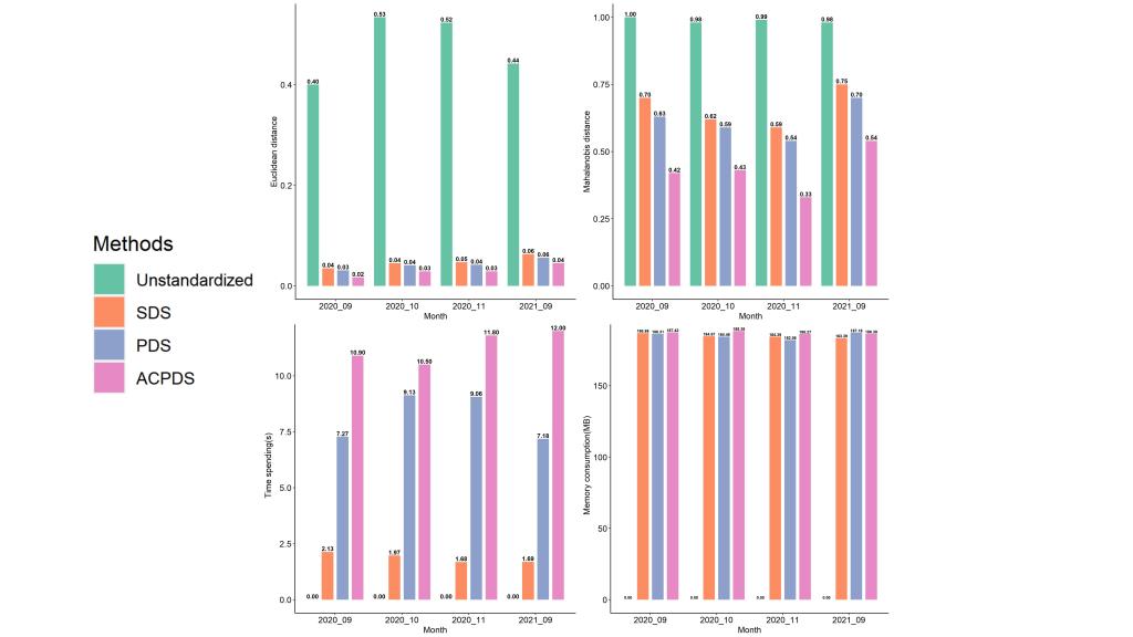 图4 标准化前与通过三种方法标准化后的平均欧式距离(a)、平均马氏距离(b)、平均运算时间(c)与平均内存占用(d)比较