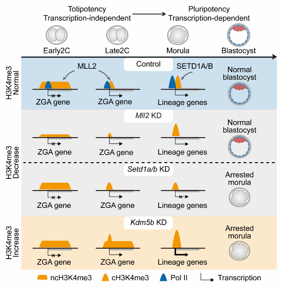 上述研究结果揭示了早期胚胎在从细胞全能性向多能性转变过程中,MLL2和SETD1A/B通过接力方式介导H3K4me3富集动态转变的机制,这为解析早期胚胎发育的表观遗传调控机制提供了新的科学依据。
