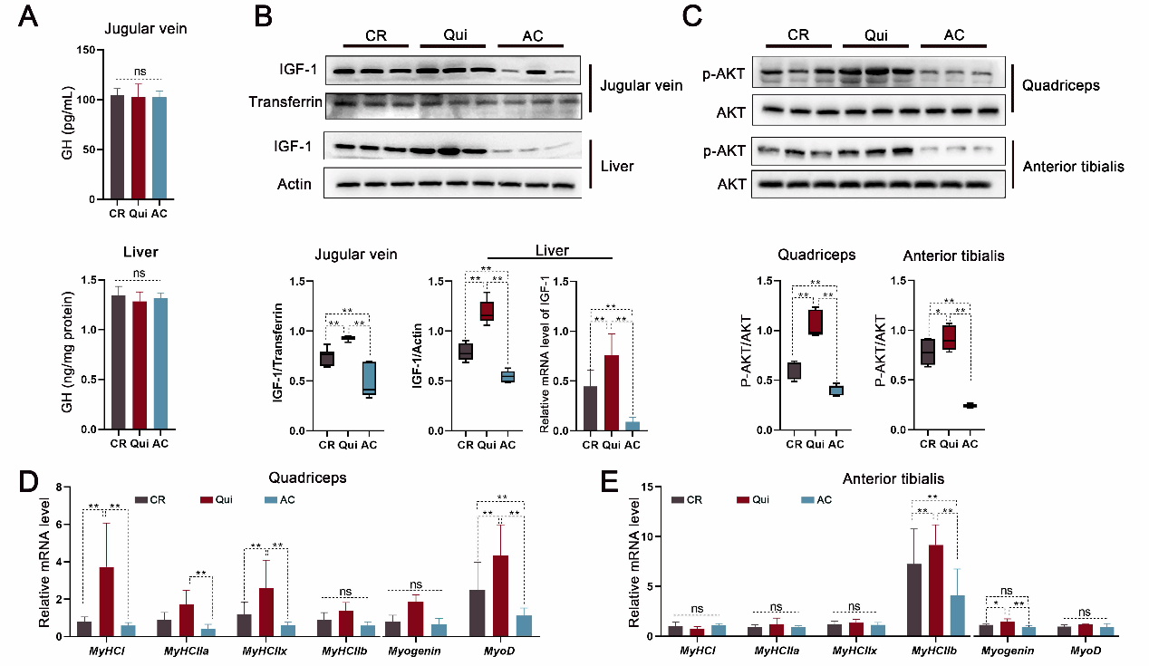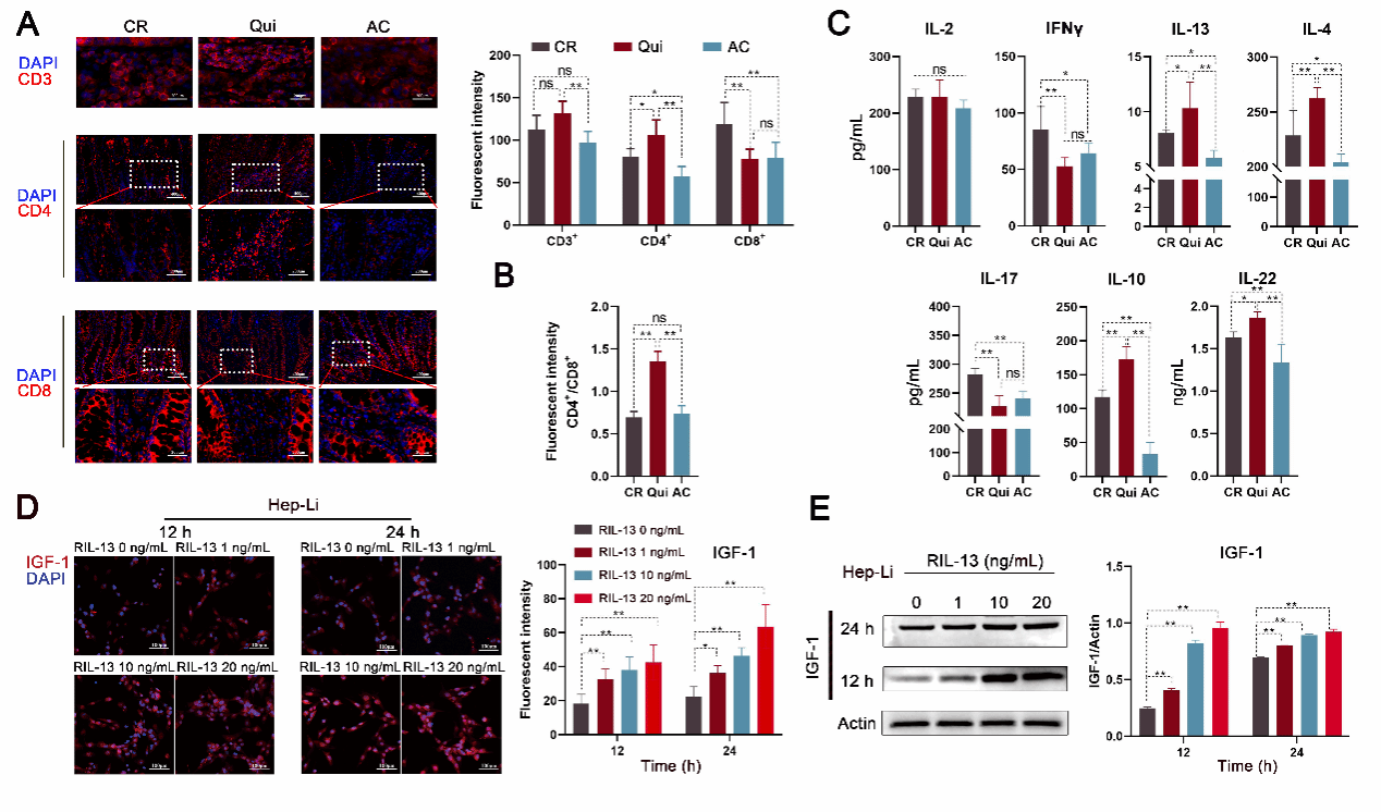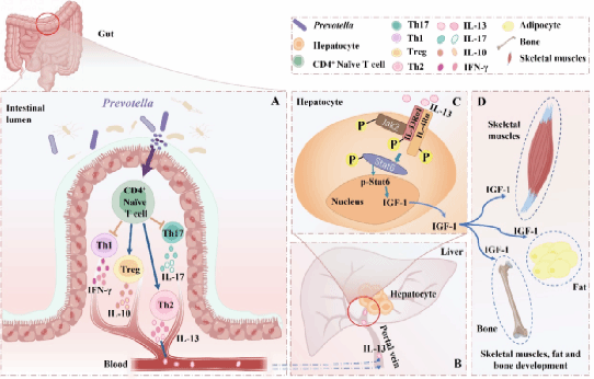 肠道微生物对宿主免疫和代谢产生巨大影响,但三者相互作用的机制至今未被完全阐明清楚。出生后的生长受生长激素轴(GH/IGF-1)的调节,即腺垂体分泌的生长激素(GH)主要诱导肝脏类胰岛素生长因子(IGF-1)合成,后者通过血液循环被转运至其他组织,增加机体合成代谢。丁一教授团队研究发现,在饲料中添加低水平抗菌剂(SLA)后仔猪肠道微生物群结构发生改变,肝脏中IGF-1显著升高,但循环血液中GH无显著变化(图1),由此推测其肠道微生物群的改变可能通过某种(些)肠源“活性物质”经汇集肠道血液的门脉循环递送至肝脏,诱导肝细胞IGF-1的产生。根据这一假设,该团队进一步研究发现SLA引起肠道普氏菌(Prevotella_copri)的富集,诱导肠道免疫由CD4+细胞亚群向Th2细胞亚群的表型转换,导致细胞因子IL-13在门脉血液中升高(图2)。随后,研究揭示这种肠源IL-13通过激活肝细胞IL-13受体-Jak2-Jak6信号通路而刺激IGF-1的合成,增加肌纤维的合成与分化,改善机体生长表型。肠源IL-13的促生长作用在幼龄小鼠体内也得到了了验证,证实了其具有跨种特性。