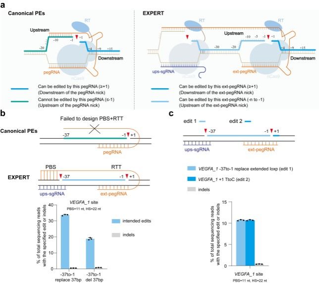Prime Editing(PE)作为一种精准基因编辑技术,相较于BE(Base Editing)技术具有碱基替换灵活、编辑种类更多、更精准等优点,但也存在编辑范围受限、长片段编辑效率较低、在猪等动物中编辑效率低等不足,这在一定程度上制约了PE技术的发展和应用。针对这些关键问题,我校动物遗传育种团队成功研发出EXPERT基因编辑技术,该技术创新性地通过在pegRNA nick所在DNA链上游引入额外切口、对pegRNA末端改造以及引入突变抑制游离片段对新链合成干扰等手段进行优化,在多个物种中实现了大片段高效精准编辑。