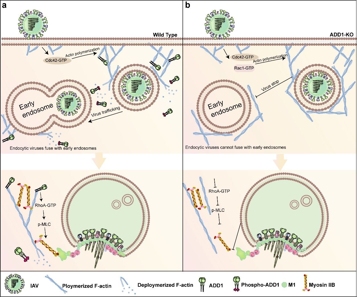 该研究揭示了流感病毒劫持细胞骨架系统进行胞内运输的新机制,并鉴定到宿主蛋白ADD1是协调流感病毒内体运输和肌动蛋白动态重排的分子开关,为抗流感病毒药物的研发提供了潜在靶标。