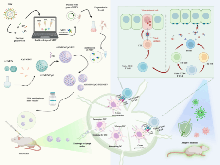 伪狂犬病毒(PRV)是严重危害养猪业的病原体,可导致母猪繁殖障碍、仔猪神经症状及高死亡率。随着PRV变异株的出现与流行,传统疫苗无法提供足够保护,且病毒存在持续进化与毒力增强风险。近年来,免疫信息学的发展有助于动物疫苗的开发,针对病毒的多表位疫苗(MEV)通过合理的构象设计能够提高稳定性并且可以显著缩短研发时间和降低成本。因此,研究团队开发了一种"智能设计-纳米递送"疫苗策略:采用免疫信息学方法合理设计MEV,以氨基修饰的中空介孔二氧化硅为载体,通过静电相互作用吸附Toll样受体9(TLR9)激动剂作为佐剂,聚乙烯亚胺(PEI)通过静电作用修饰载体表面以负载MEV。该疫苗可以被抗原呈递细胞高效摄取、加工和呈递,增强细胞和体液免疫,从而有效预防和控制病毒感染。动物实验证实其能有效清除靶器官病毒载量,实现对致死剂量病毒感染的完全防护。
