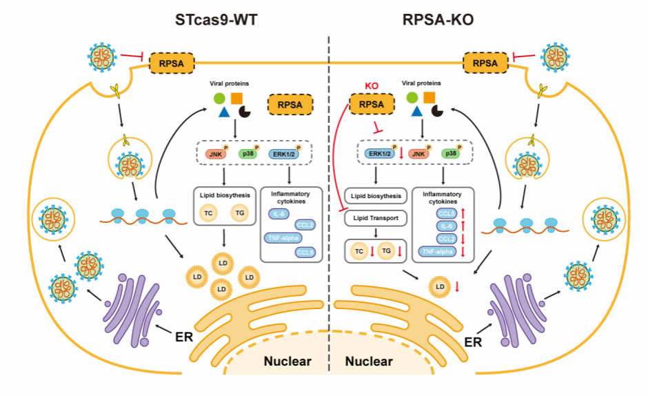李文涛团队构建了基于人全基因组和猪膜蛋白CRISPR/Cas9敲除文库的高通量基因筛选平台。成功运用该技术筛选和鉴定出参与PEDV入侵和复制的重要宿主因子ST3GAL4和RPSA。在该项研究中,团队成员发现敲除ST3GAL4或RPSA均显著抑制PEDV感染。研究发现ST3GAL4可以上调细胞表面唾液酸丰度,PEDV利用唾液酸作为附着因子从而促进PEDV的入侵。且该研究首次揭示了PEDV的唾液酸偏好性,为PEDV的入侵机制提供了全新视角。另一项研究发现RPSA可以上调宿主细胞的MAPK信号,PEDV利用MAPK通路促进PEDV的复制。这些结果表明ST3GAL4和RPSA是PEDV入侵和复制的关键宿主因子。