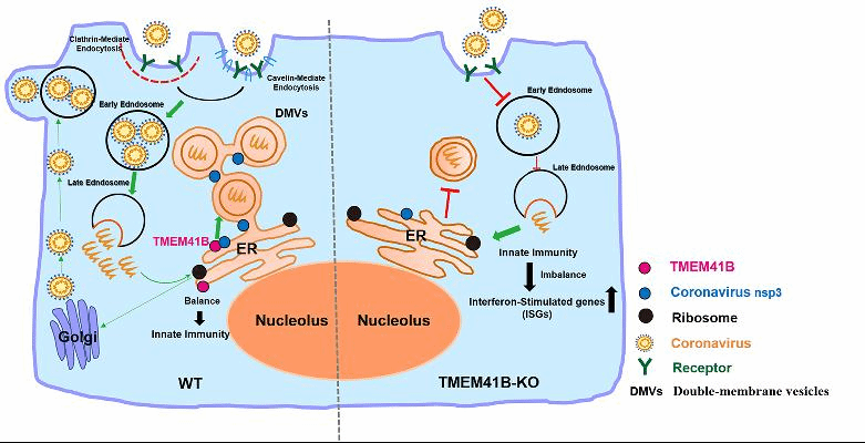 图1. TMEM41B参与病毒复制双层囊泡形成的机制模式图