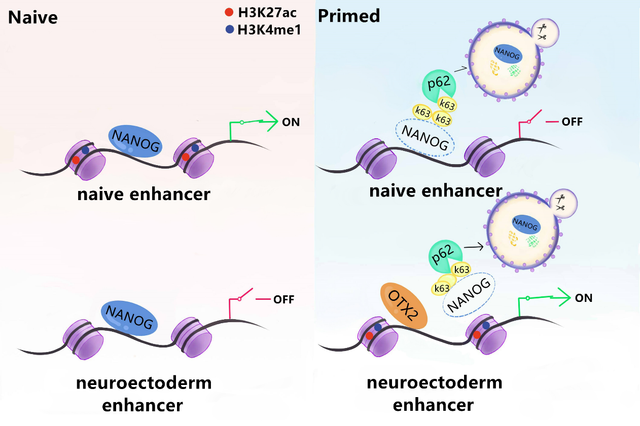 研究中主要利用Naïve-Primed胚胎干细胞转换和围着床期体内胚胎发育两种模型,在体外胚胎干细胞naive-primed转换模型中,通过构建mCherry-GFP-LC3双荧光报告细胞系,监测了naive态胚胎干细胞多能性转变过程中自噬通量的变化,证实了自噬对干细胞命运转变的决定性作用(图1)。另外,通过CRISPR/Cas9构建的ATG7敲除动物模型,评估了自噬丧失会损伤围着床期胚胎的着床过程,进而导致神经发育异常及死亡。进一步基于RNA-seq和染色质转座酶可及性测序(ATAC-seq)联合生物信息学分析,描绘了naive-primed转换过程染色质可及性动态变化规律,并发现细胞自噬阻断后NANOG作为阻止多能性转变的屏障,一方面抑制分化相关位点的开放,另一方面维持naive多能性基因位点的开放以抑制多能性退出。此外,通过染色质免疫共沉淀测序技术(ChIP-seq)证明了NANOG通过竞争性结合OTX2调控的特异性神经外胚层发育的相关区域来抑制神经元分化(图2)。