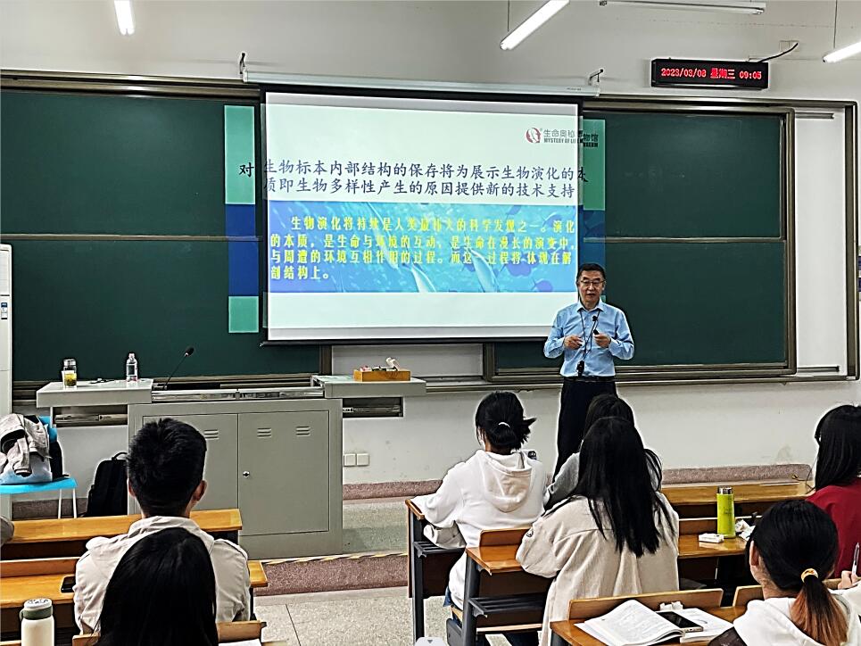 (通讯员:闫子涵)2023年3月8日上午,大连医科大学隋鸿锦教授莅临我校,在四教B212开展了2023年我院第一期名师示范课——《生物多样性-在塑化标本中寻找答案》,授课从“什么是塑化标本,塑化标本的好处以及如何通过塑化标本进行教学和科学研究”三方面介绍生物多样性,然后从动物的多样性角度阐述不同动物生存进化策略,如何解决生存过程中吃的问题(食物)和防止被吃的危险(被捕食),在能够生存的基础上动物采取不同的繁衍后代模式,从而确保物种的延续。课堂上与学生充分互动,课后还与师生进行了热烈的讨论和深入的交流。