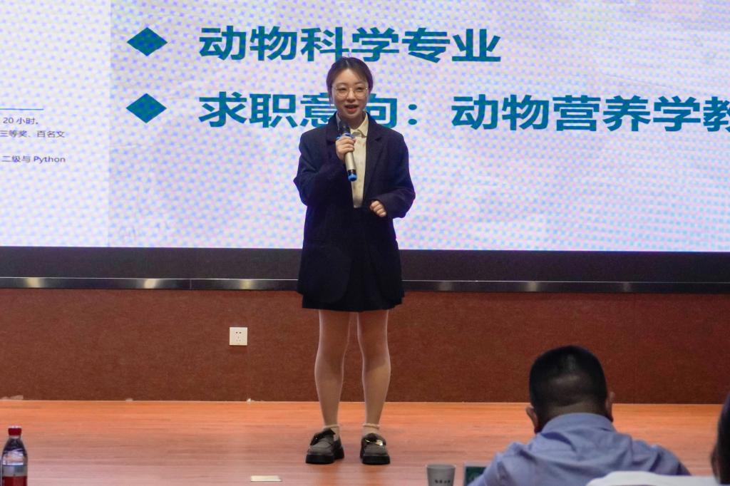 大赛开始,15位选手依次上台进行限时1分钟的自我介绍和简历展示,在此阶段排名前10的选手将进入决赛的下一阶段。六号选手邱杰若从专业知识技能、科研组织协调能力和授课表达能力三个方面进行自我介绍。邱杰若思路清晰、语言流畅地表达了自己应聘动物营养学教授岗位的求职意愿,但因内容不够明确、主题不够突出等问题最终获得89.18分,遗憾止步决赛的下一阶段。