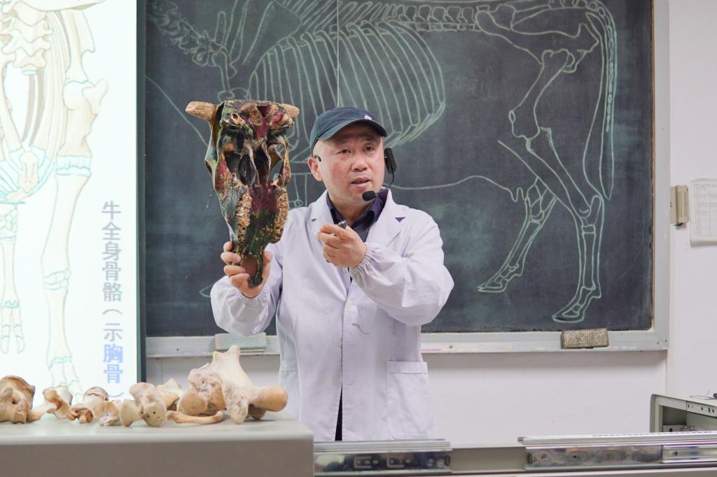 3月26日晚,动科楼解剖教室,动科动医学院基础兽医系教授邱德新正在向参赛小组代表讲授骨学基础知识。邱德新按照“头骨”、“躯干骨”、“四肢骨”的顺序简要讲解牛骨骼特点。对于非动科动医专业的同学提出的问题,他也耐心地答疑解惑,并表示:“以前没有接触过骨学知识的同学不必担心,此次比赛会兼顾各个专业的同学,让大家尽情去享受这个过程。”