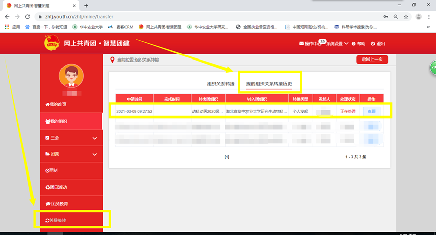 (4)学院团工委将会在系统中进行“组织关系转接审批”,完成团组织关系转接流程;