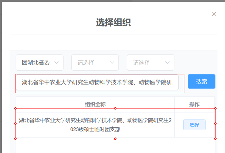 注:选择组织界面只选择“团湖北省委”即可,后面请勿选择“团武汉市委”,否则会出现搜索不到的情况。