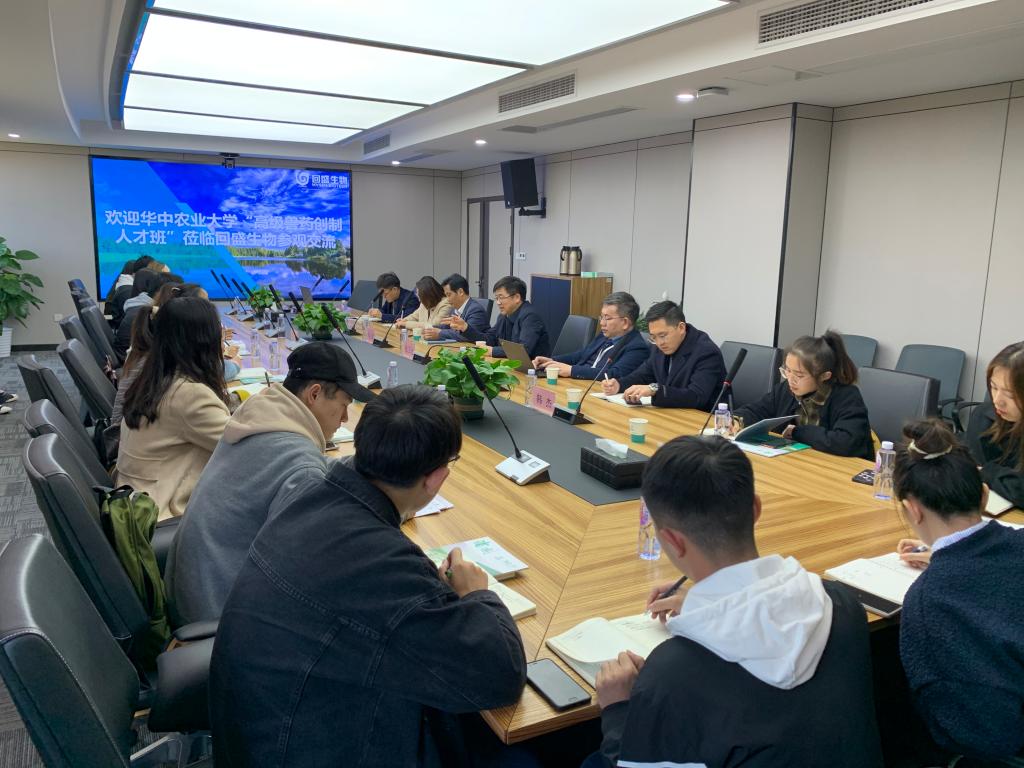 座谈交流环节,武汉回盛生物科技有限公司董事长张卫元对华农师生们前来回盛参观交流表示热烈欢迎。他分析了国内外兽药行业目前的发展现状,国内兽药行业的特点以及宠物市场未来的发展方向,介绍了回盛生物的基本情况以及未来五年的发展目标。他表示,公司与华农情感联系源远流长,回盛近期与华农签订5年战略合作协议,共同成立的“华农-回盛研究院”更是双方长期友好合作的结晶和升华。他希望同学们能借此契机深入了解行业,未来各类实习机会。