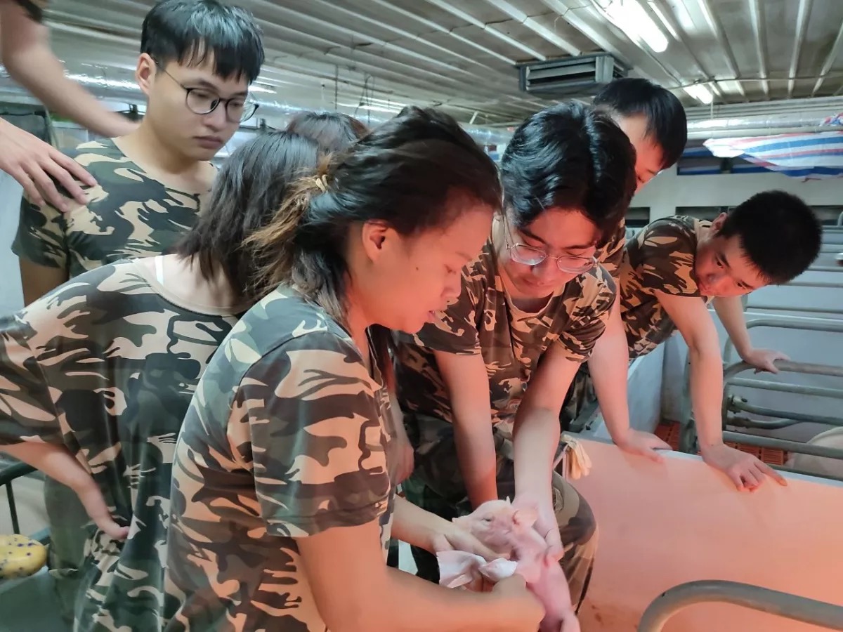 本次实习期间,分娩组同学的工作内容包括给10头母猪接产,给400头仔猪注射铁剂和头孢、进行剪尾打耳标及给仔猪去势等,通过理论课程和实践操作学习,同学们掌握了产后检查和鉴别产后母猪的子宫问题、产房温度环境管理、疝气猪去势和产仔监控等技能。