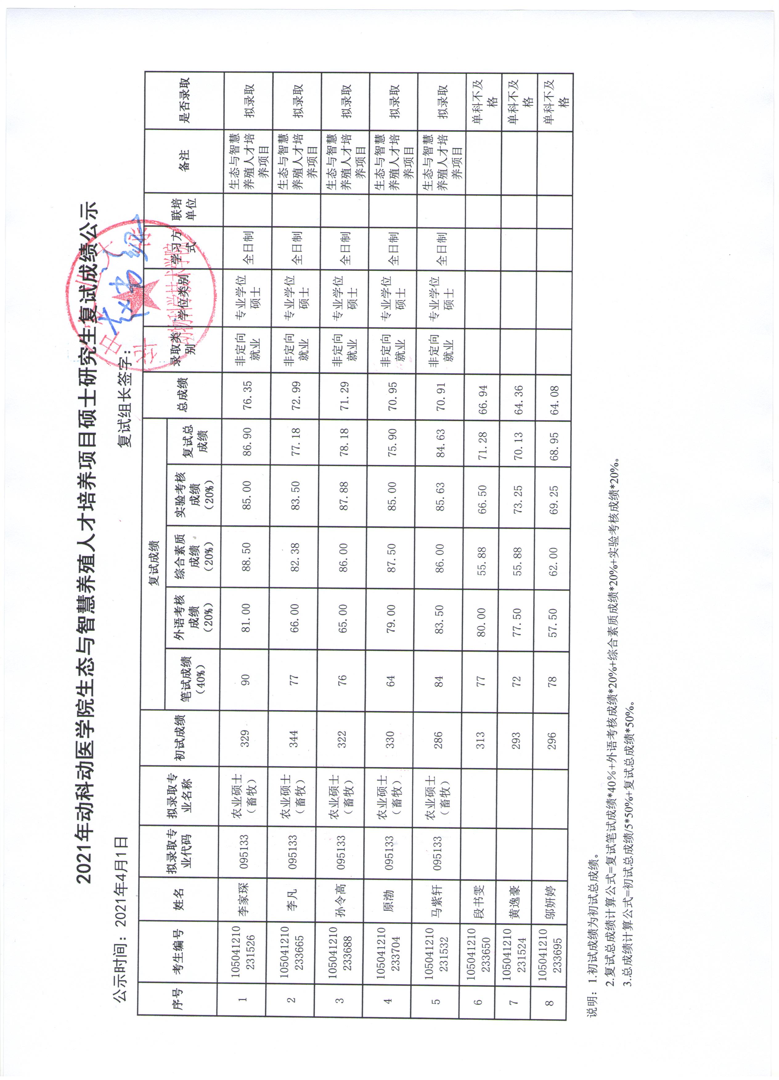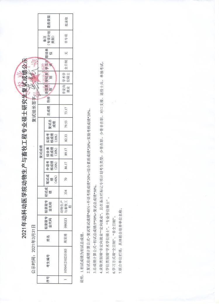 农业硕士(畜牧)专业学位复试成绩公示