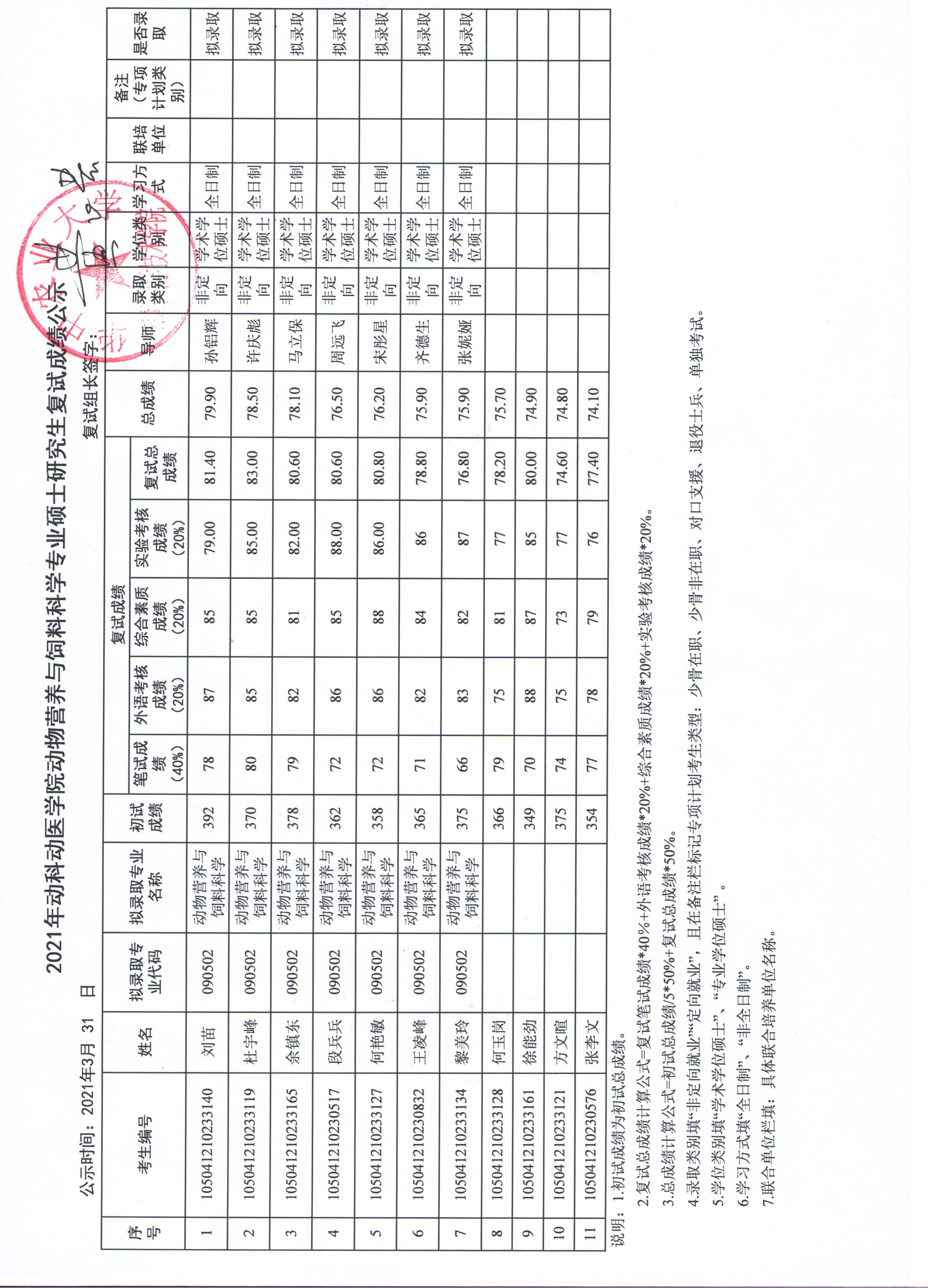 动物营养与饲料科学专业复试成绩公示