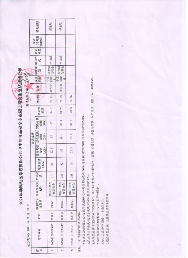 兽医公共卫生与食品安全专业复试成绩公示