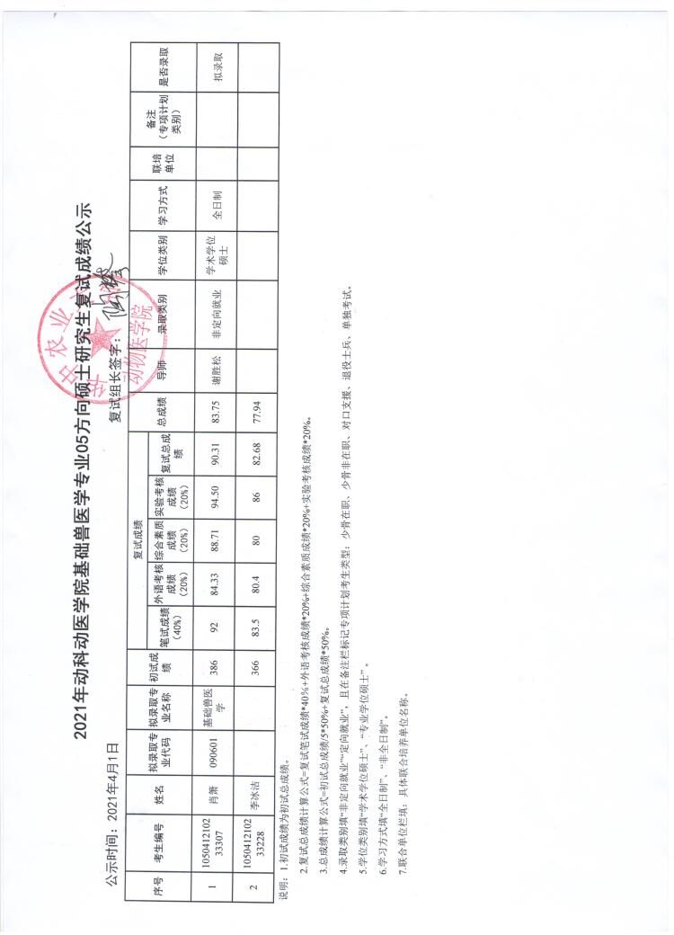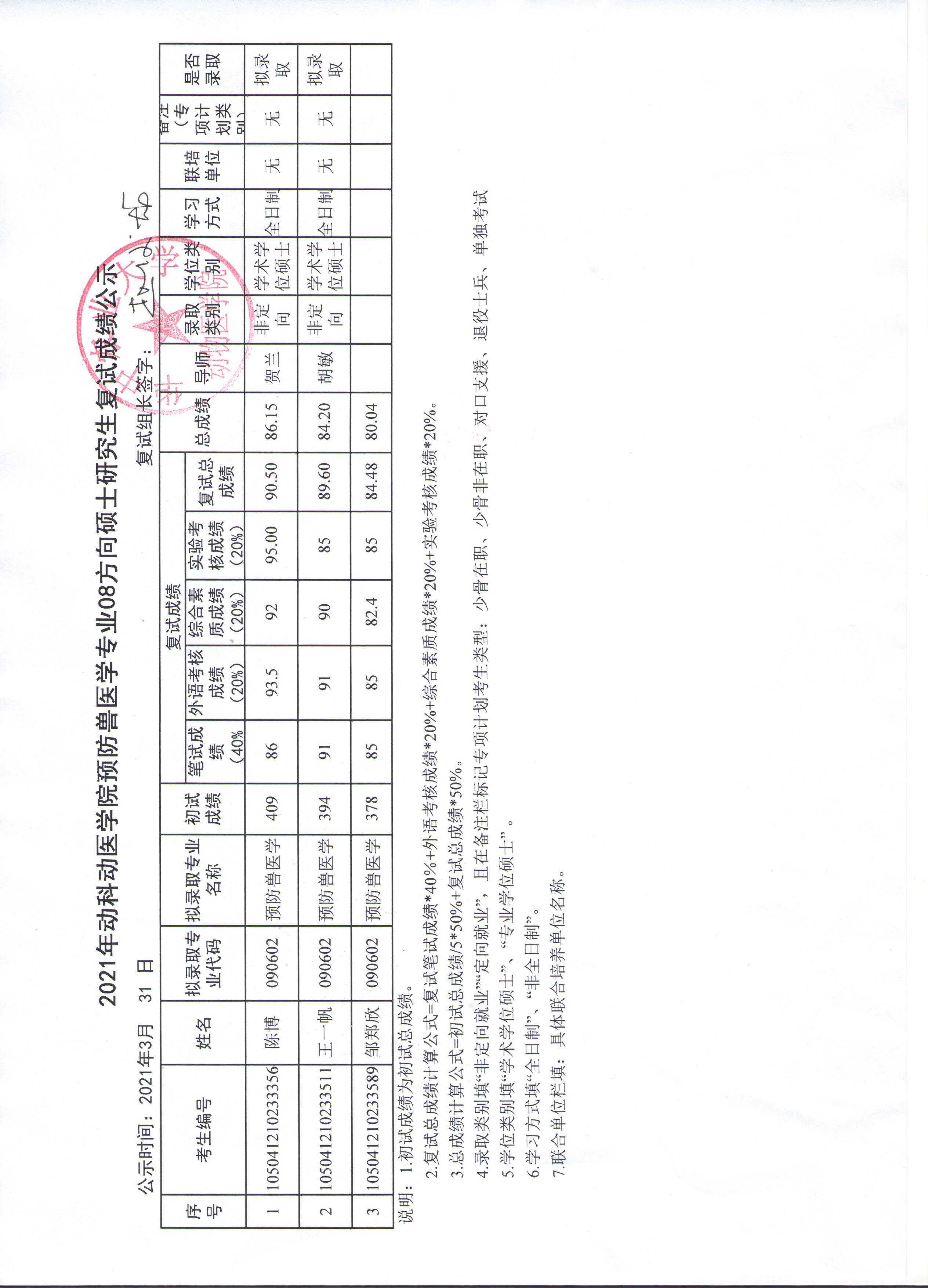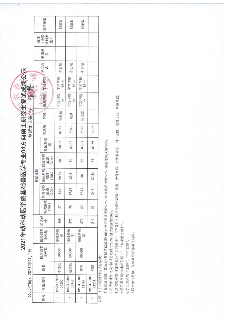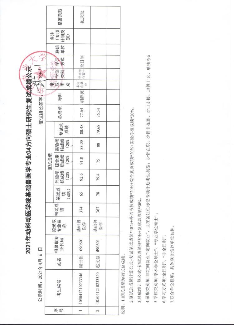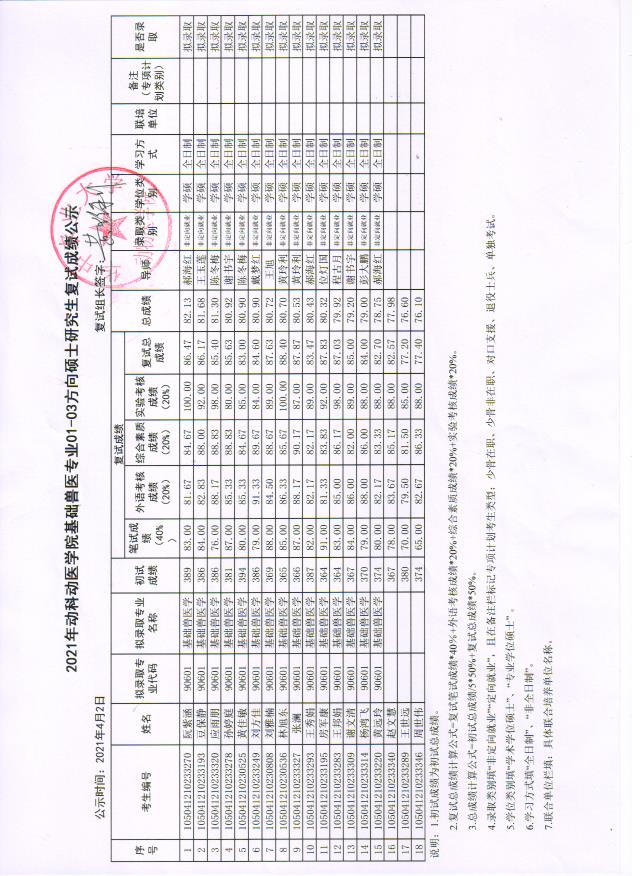 基础兽医学专业04方向调剂复试成绩公示