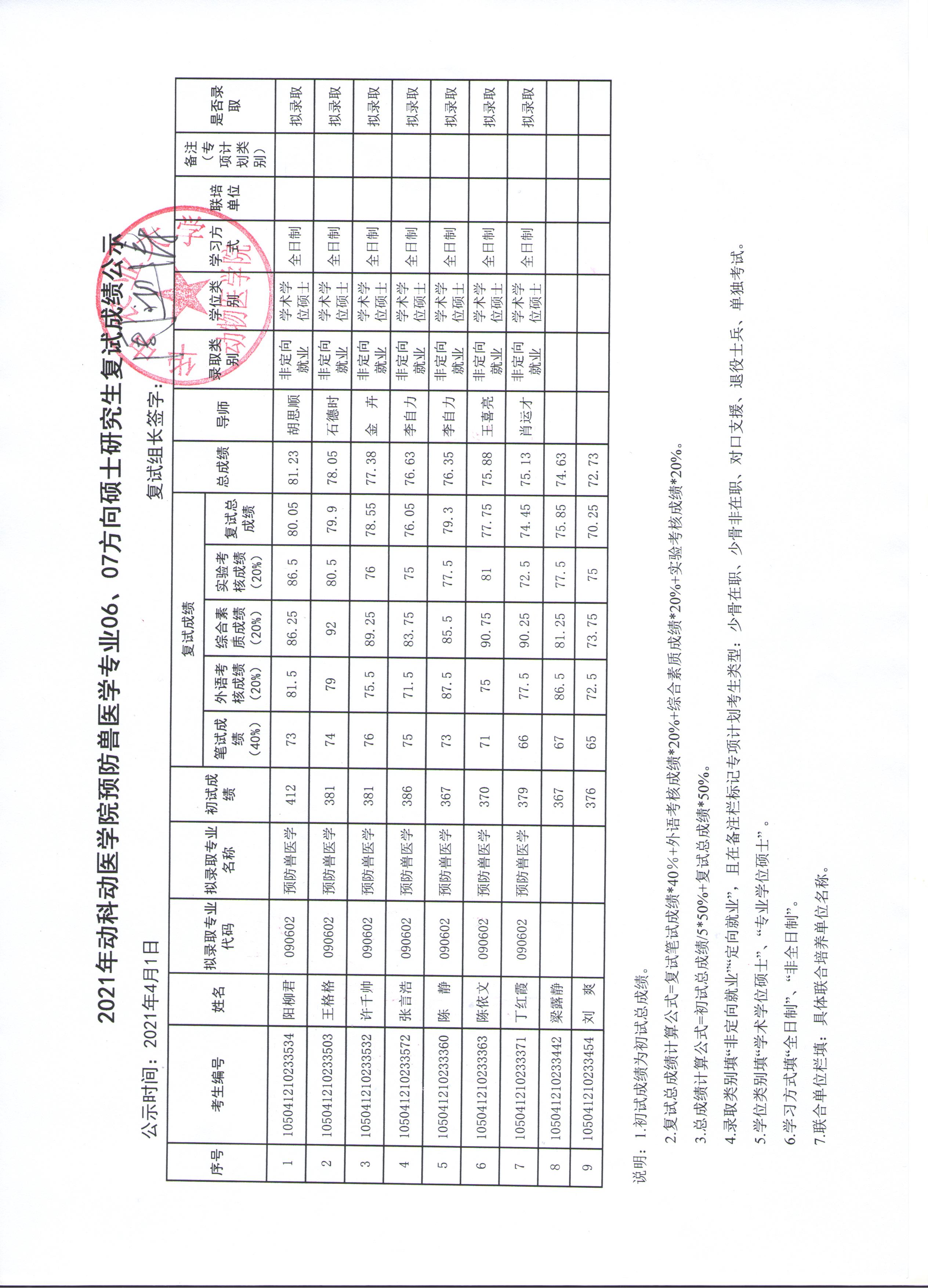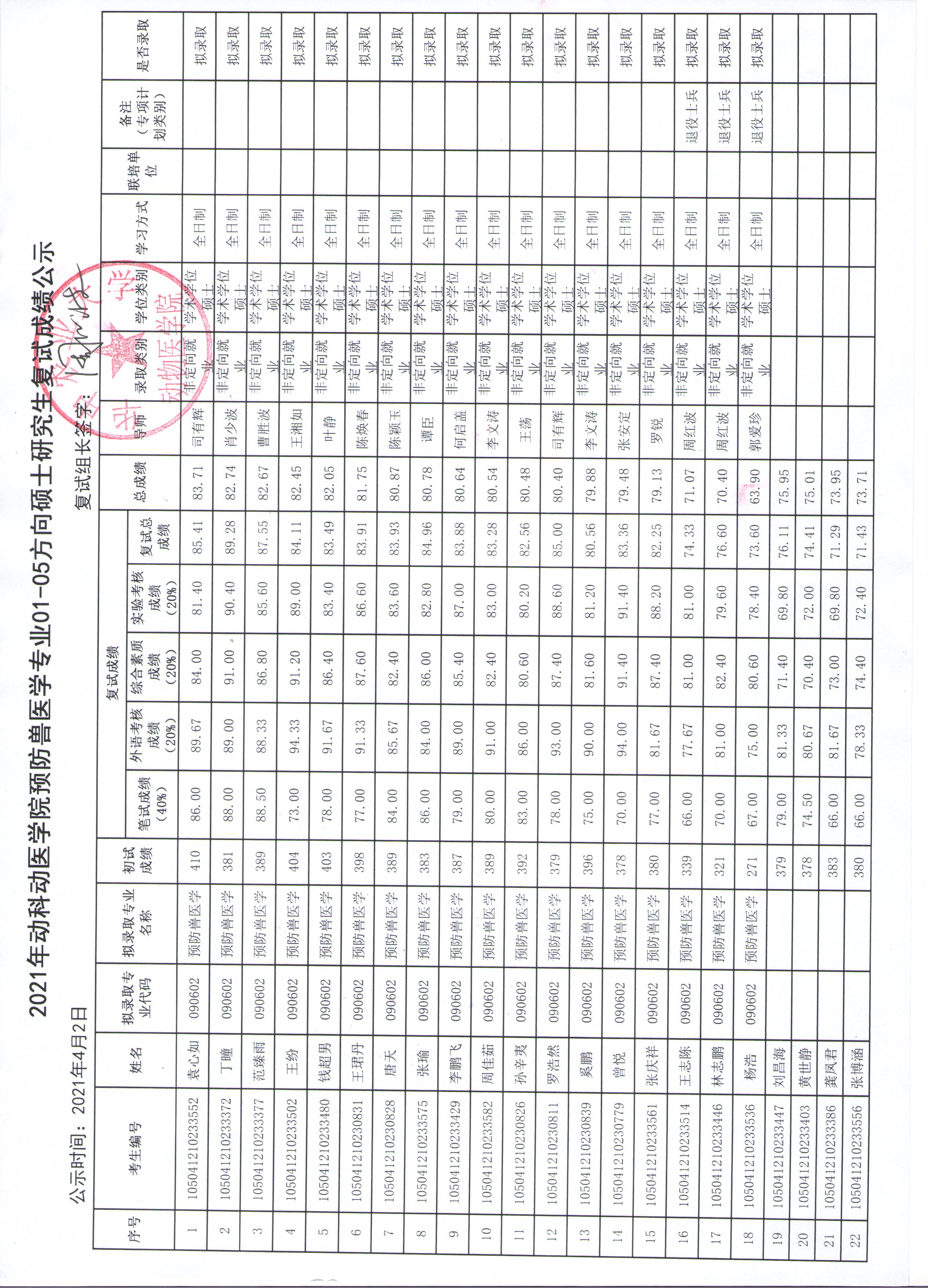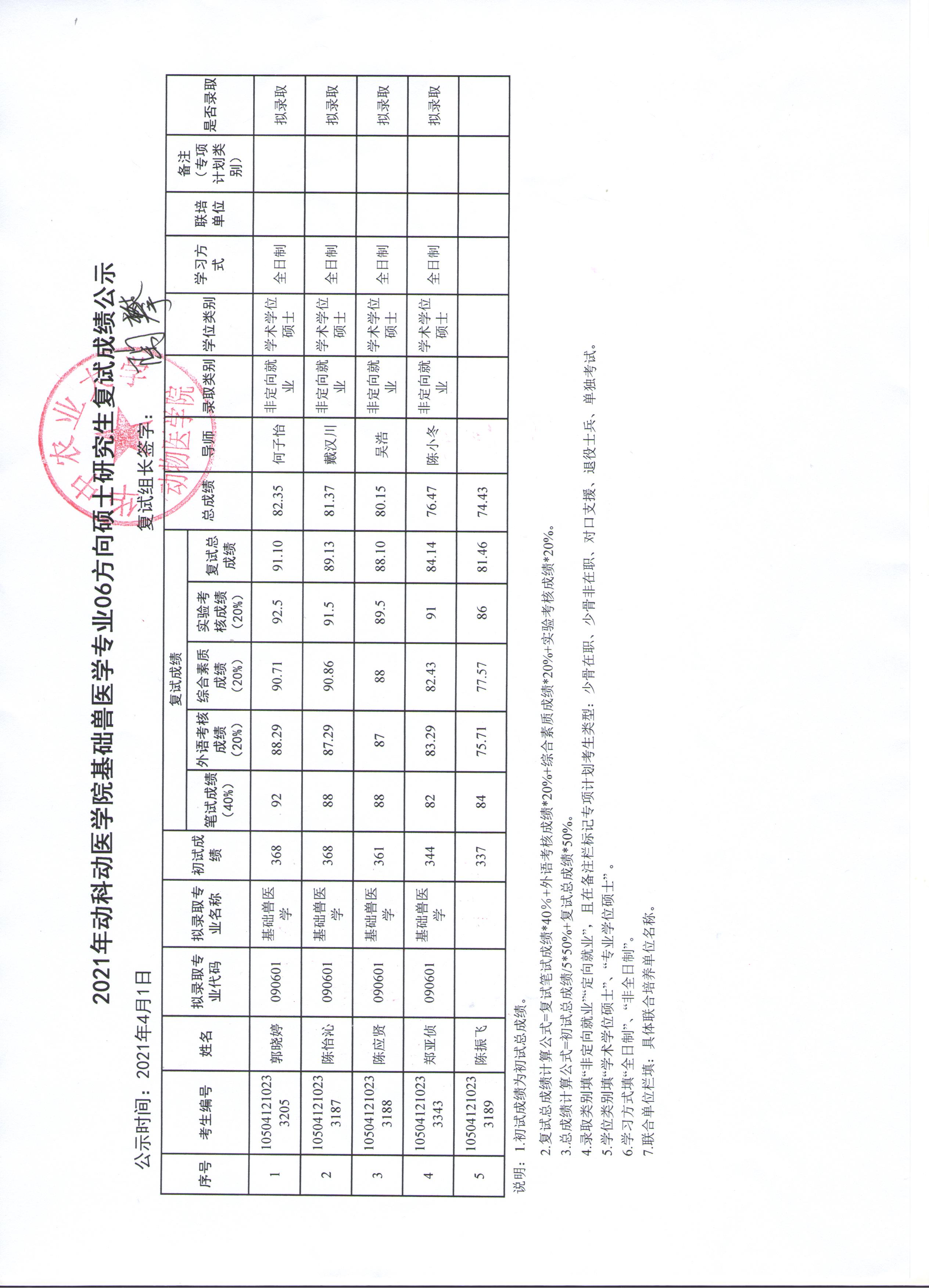基础兽医学专业04方向调剂复试成绩公示