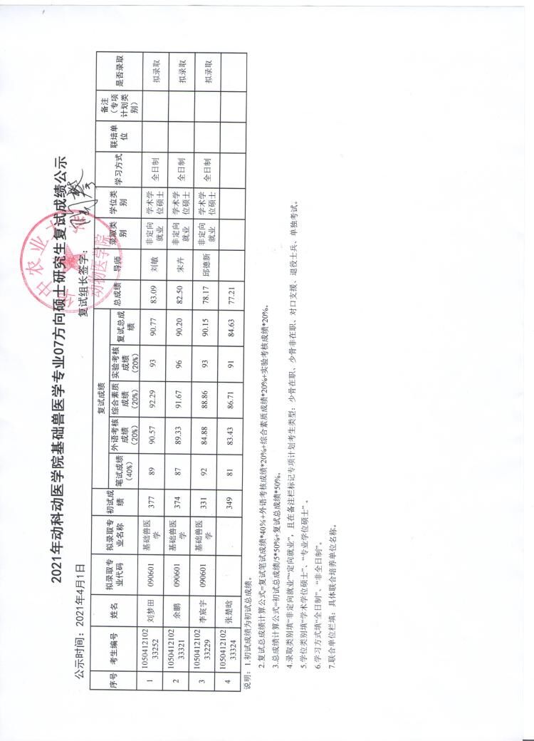 基础兽医学专业04方向复试成绩公示
