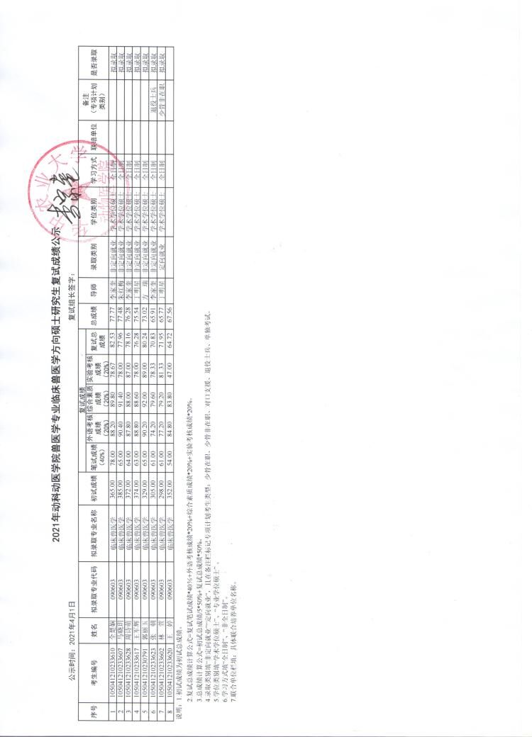 临床兽医学专业复试成绩公示