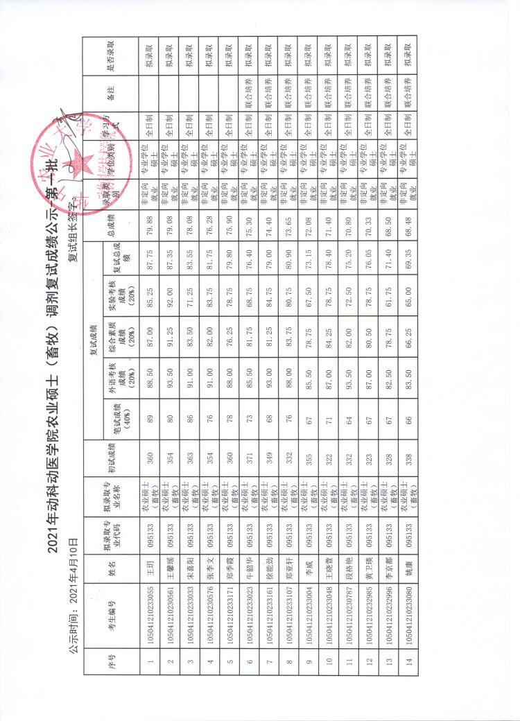 农业硕士(畜牧)专业学位调剂复试成绩公示-第一批