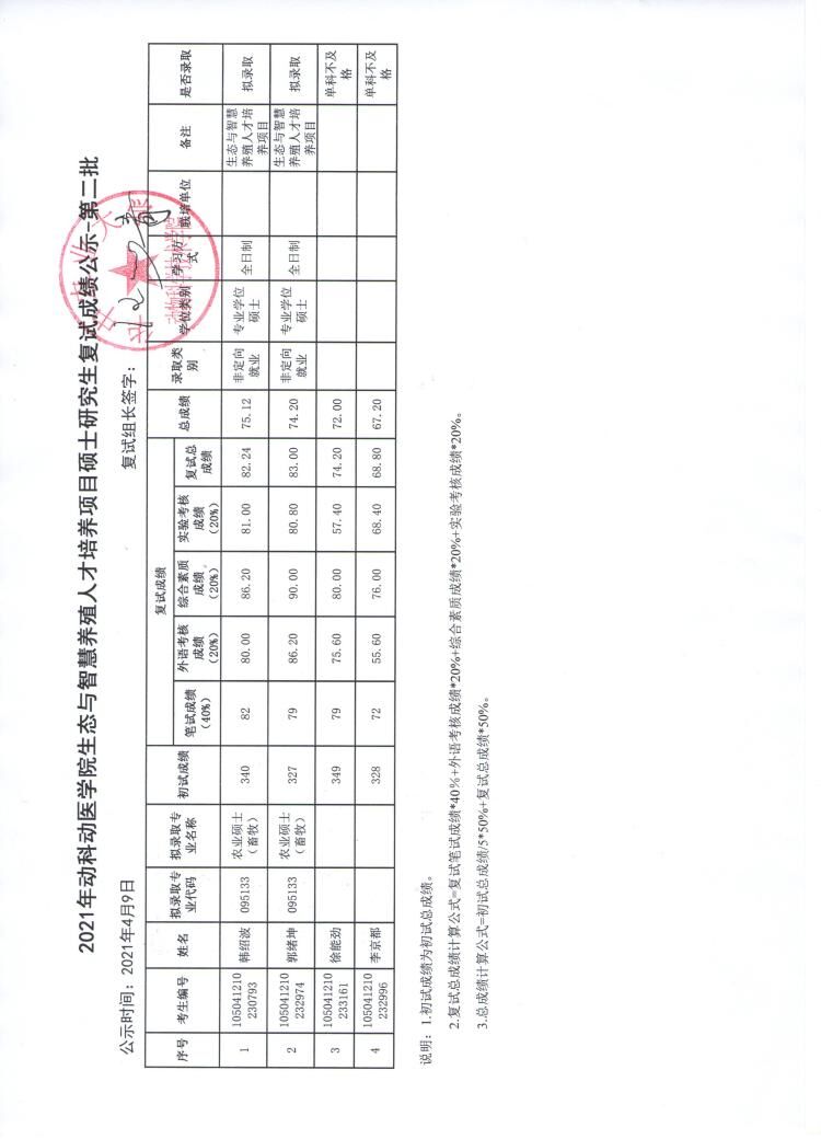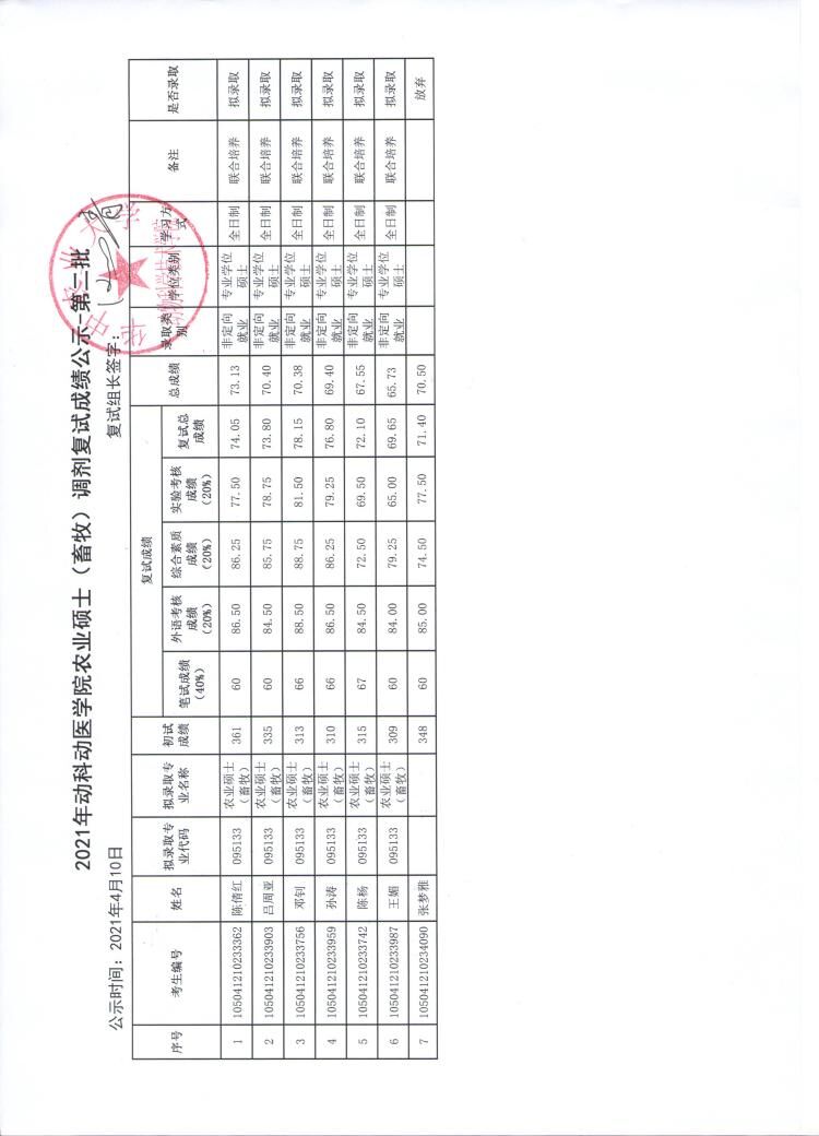 农业硕士(畜牧)专业学位调剂复试成绩公示-第二批