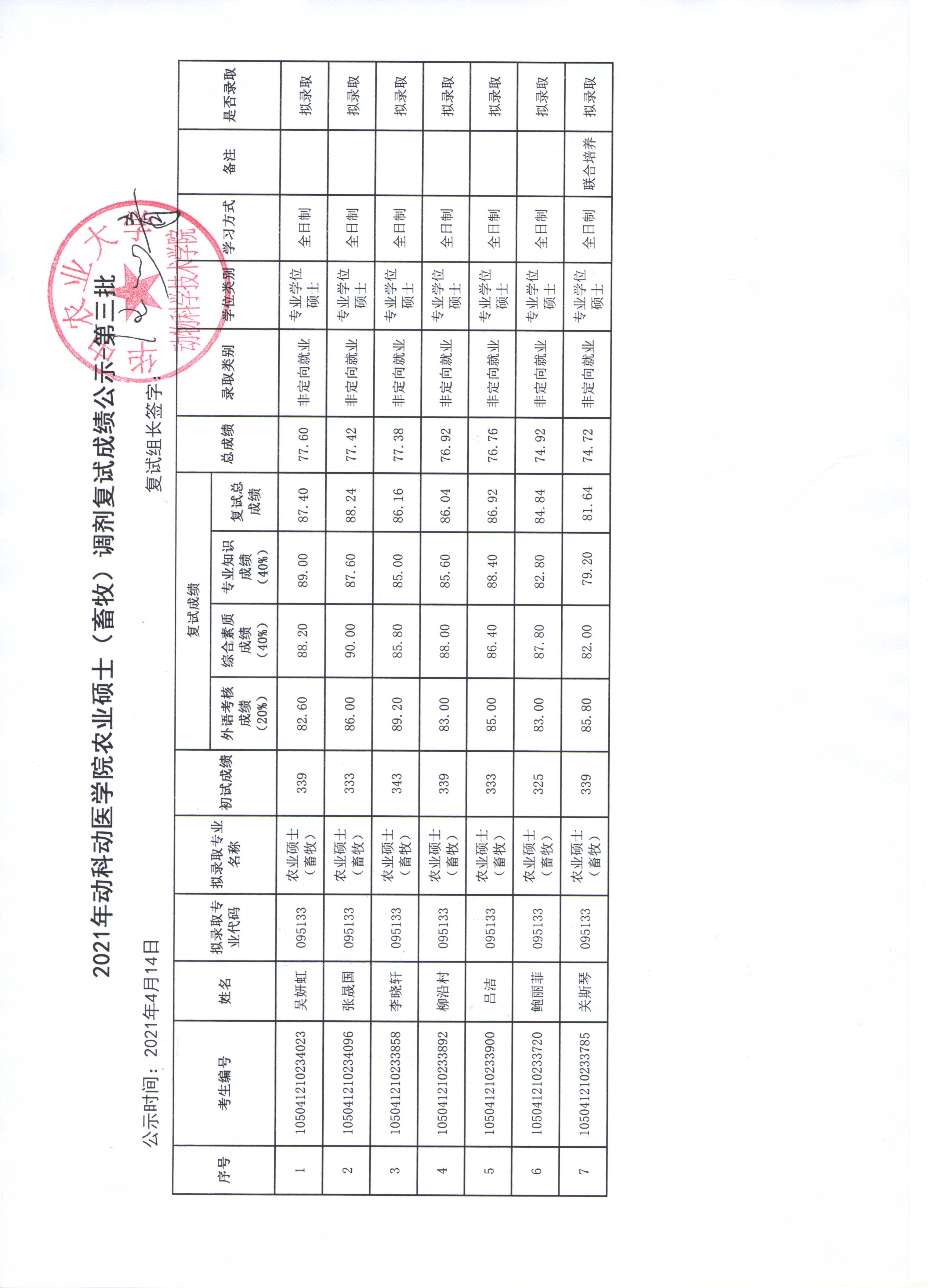 农业硕士(畜牧)专业学位调剂复试成绩公示-第三批