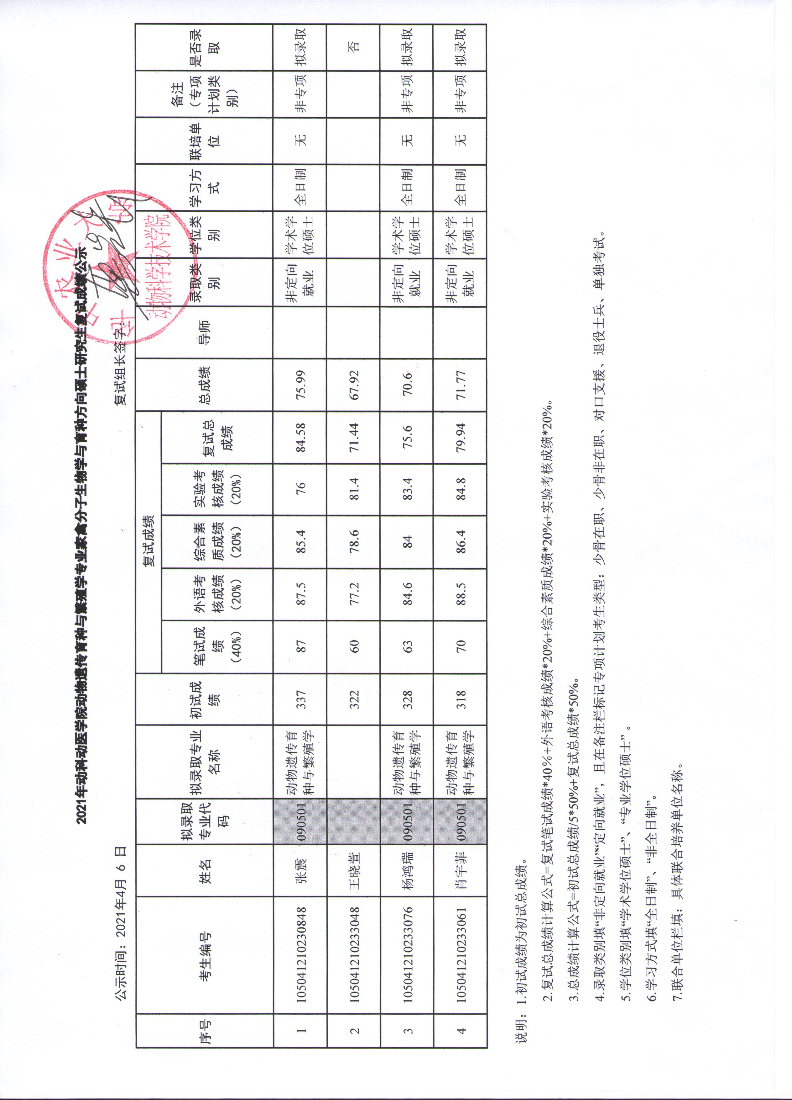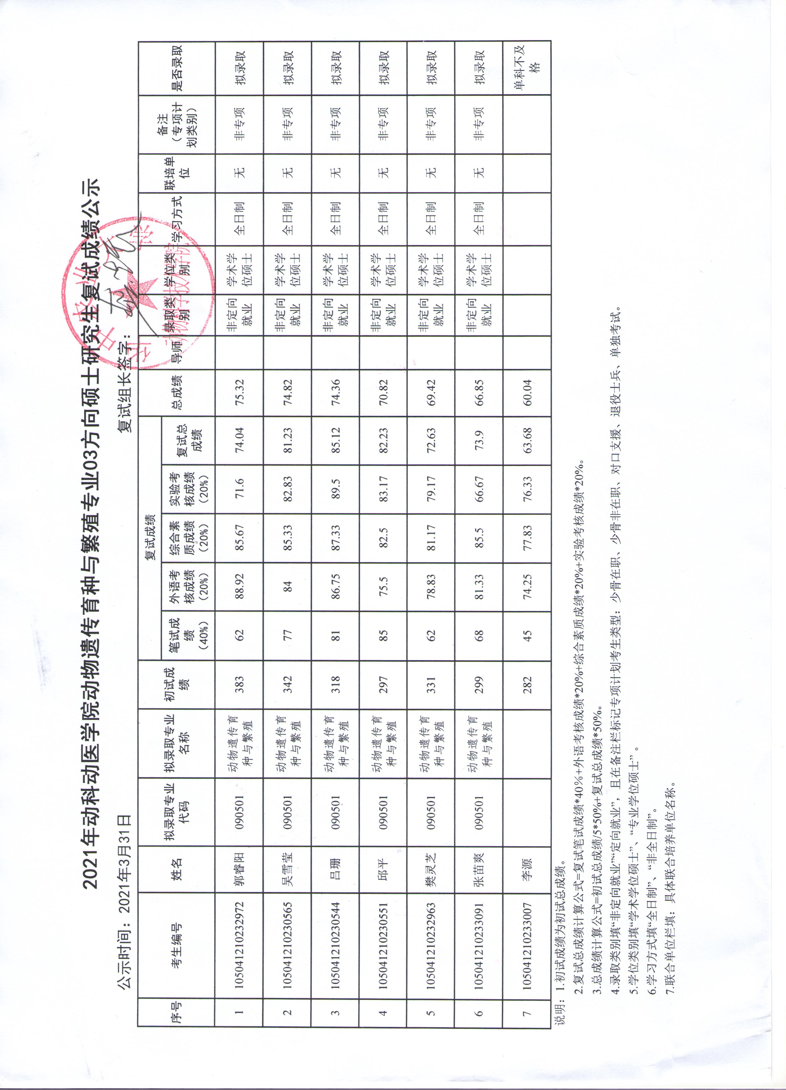 动物遗传育种与繁殖04方向复试成绩公示