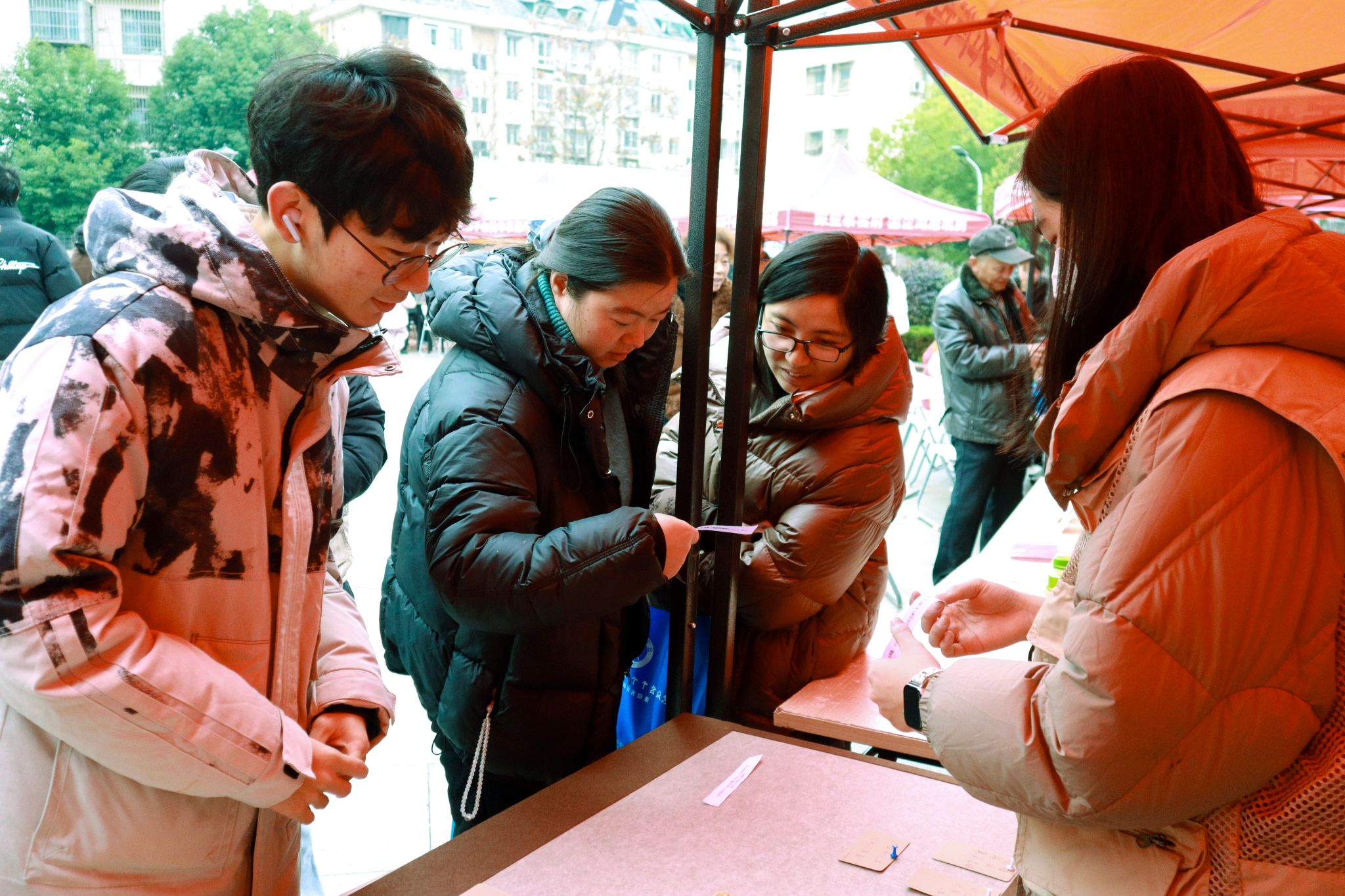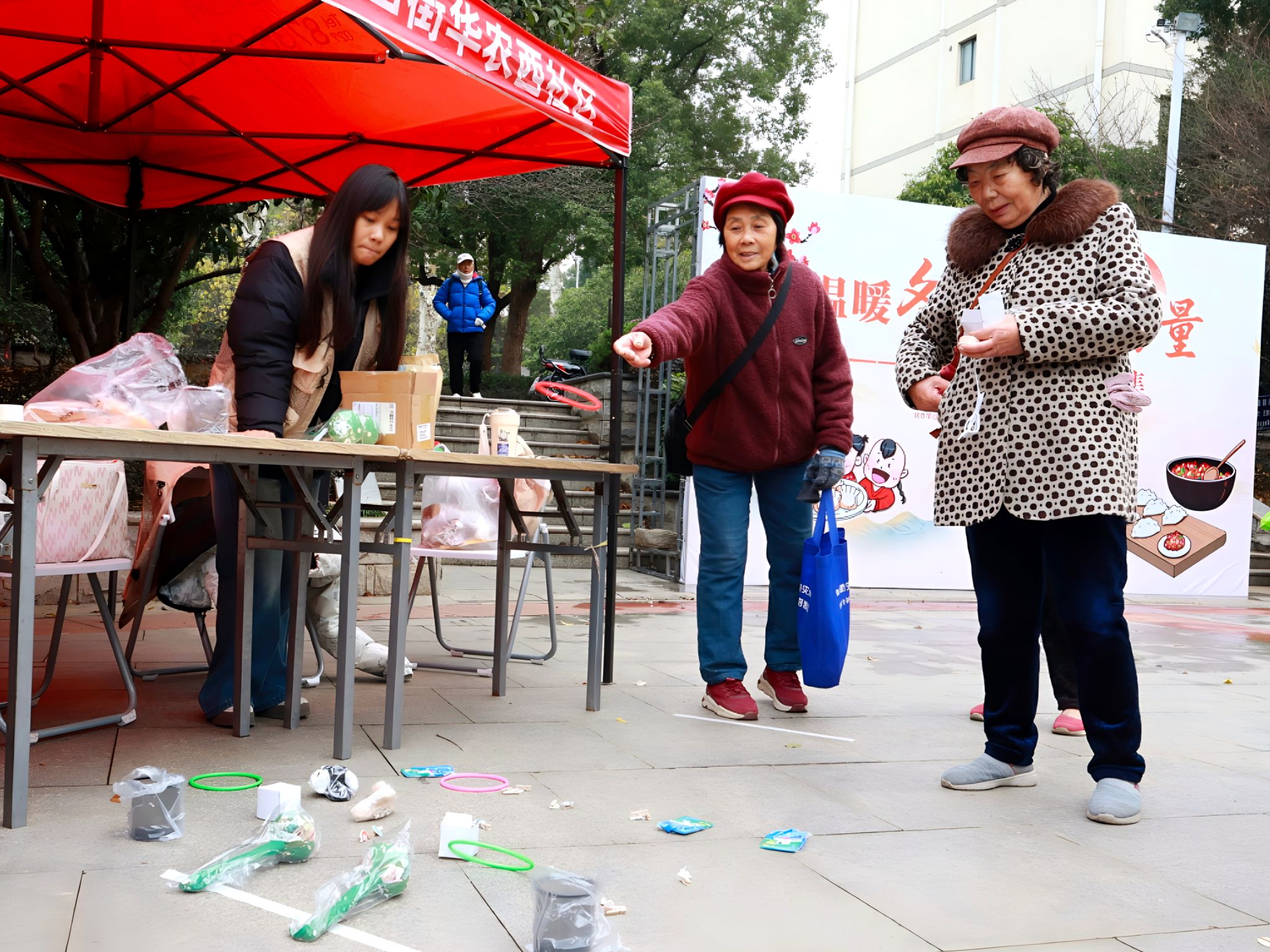 上午8时30分,志愿者们抵达西苑社区小广场,在社区工作人员的指导下,迅速完成物资领取与摊位布置工作,静候社区居民到来。活动现场设置四大特色服务区域,分别开展“团圆乒乓球”“冬至遇回归知识问答”“祝福留言板”“趣味套圈”特色活动。各区域均配备三名志愿者,一位志愿者负责引导参与及发放奖品,另外两位志愿者则负责摄影与物资补给工作。上午11时30分,志愿者完成物资整理收纳,至此活动结束。