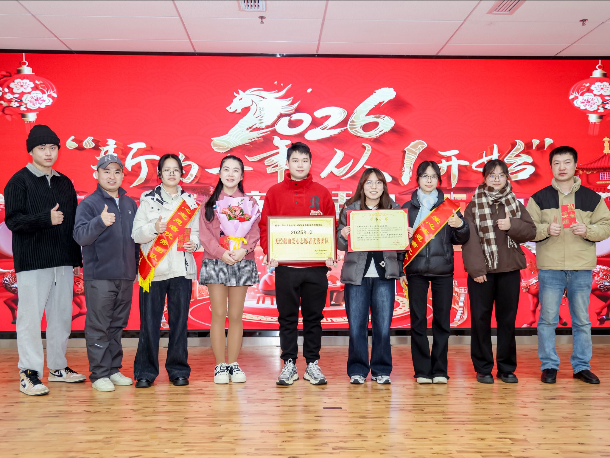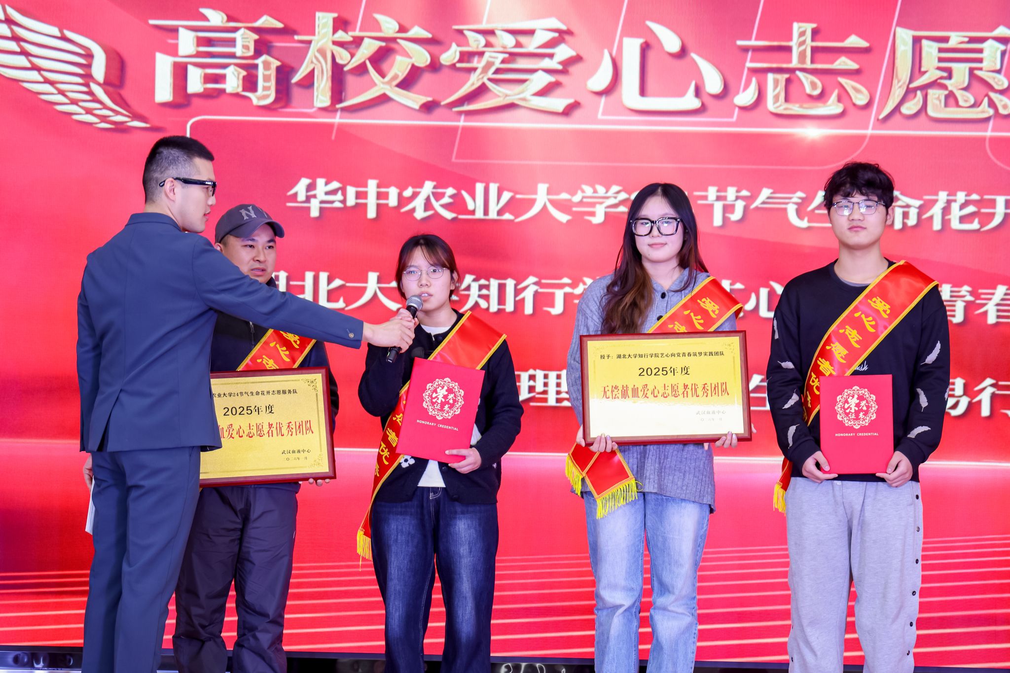 随后进入颁奖环节,大会对2025年度在无偿献血工作中表现突出的集体与个人予以表彰。其中,我校由红十字会、牧医阳光志愿服务队、生物技术本科生第二党支部共同组建的“二十四节气生命花开”志愿服务团队凭借在无偿献血组织动员、科普宣传及志愿服务中的持续付出,荣获“武汉市无偿献血高校爱心志愿者团队”称号。此外,大会依次表彰了爱心家庭、热血传递优秀个人、新晋200次献血者以及“荣退”的献血者等群体。