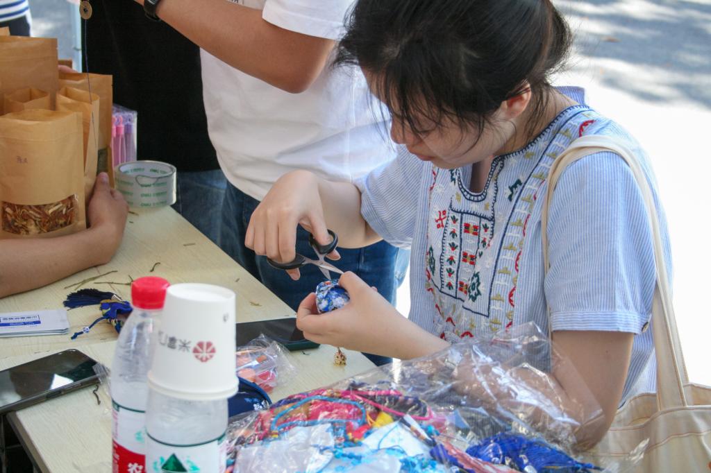 在有奖问答互动进行的同时,一旁的香囊制作组的工作也如火如荼地进行着。通过问答环节的部分同学选择用青志工作人员准备好的香料和香包来制作端午艾草香囊,剩余的同学则选择制作手绘帆布包。“参加有奖问答是一个交流学习的过程。在活动过程中,我对于中国传统节日端午节的历史溯源、发展过程有了更深入的了解。这是我第一次亲手缝制香囊,炎炎夏日里能安静地DIY香囊也是一次不错的经历。”来自动科2005班的胡亚丽说道。