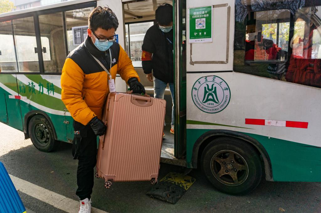 “请同学们切换行程码、返校单、核酸检测证明,另外中高风险地区的同学请暂不返汉。”2月20日下午3时许,伴随着广播声,西大门入口处返校学生陡增。动科动医学院志愿者严格依照常态化疫情防控要求,引导返校学子进入正确通道,接过他们手中的大件行李,送上校园摆渡车,在返校高峰期工作依然有条不紊。