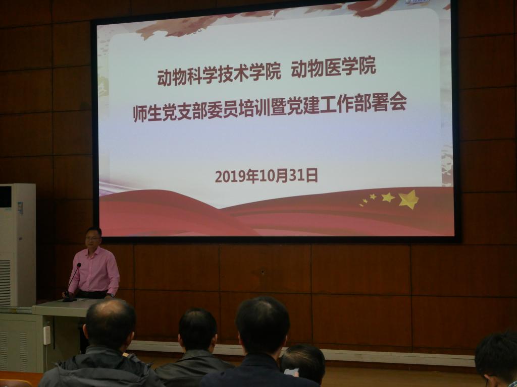 (动科动医学院通讯员 杨亚萍 毛海英 供图 杨凤鸣 陈玉霜)10月31日,动科动医学院在三教S2报告厅召开2019年师生党支部培训暨党建工作部署会,参加会议的有学院党委书记刘兴斌、学院党委副书记代金贵和学院各级师生党支部书记、支部委员。