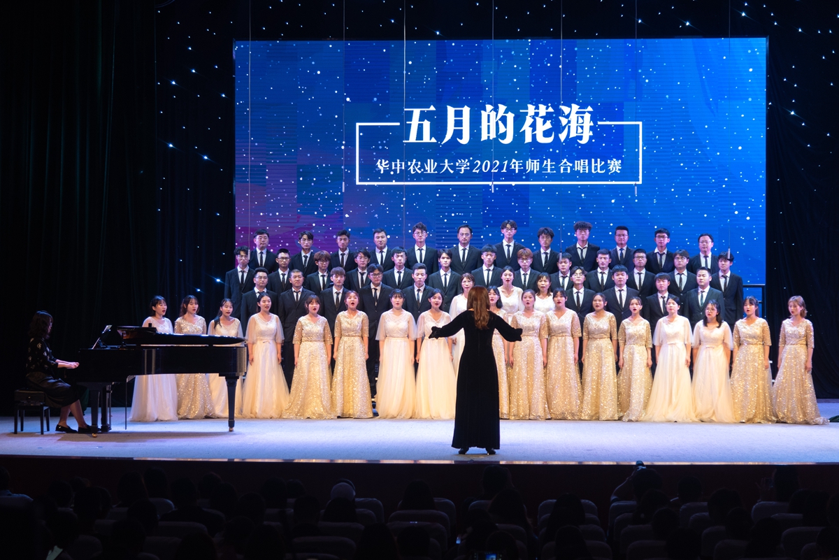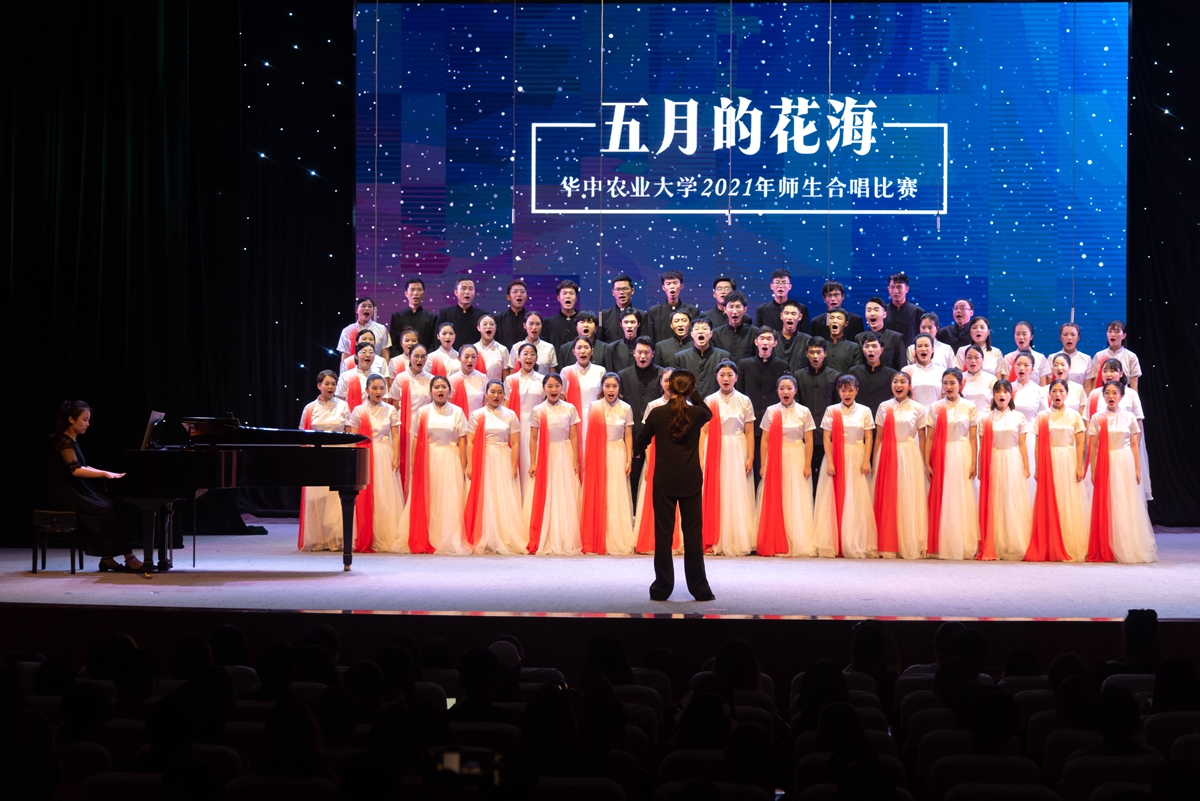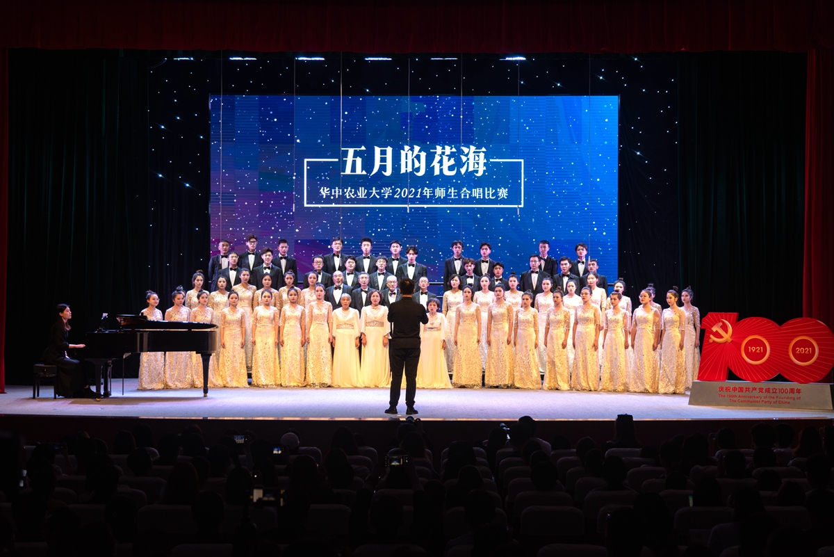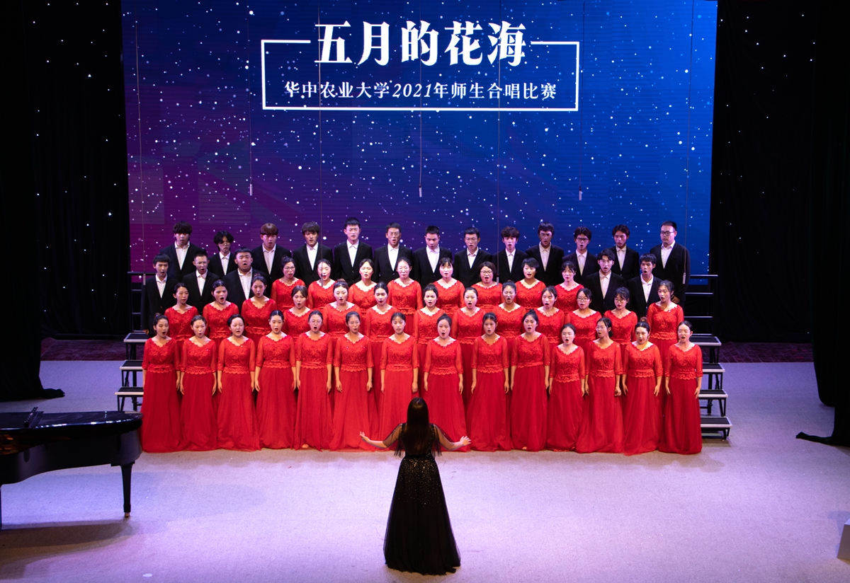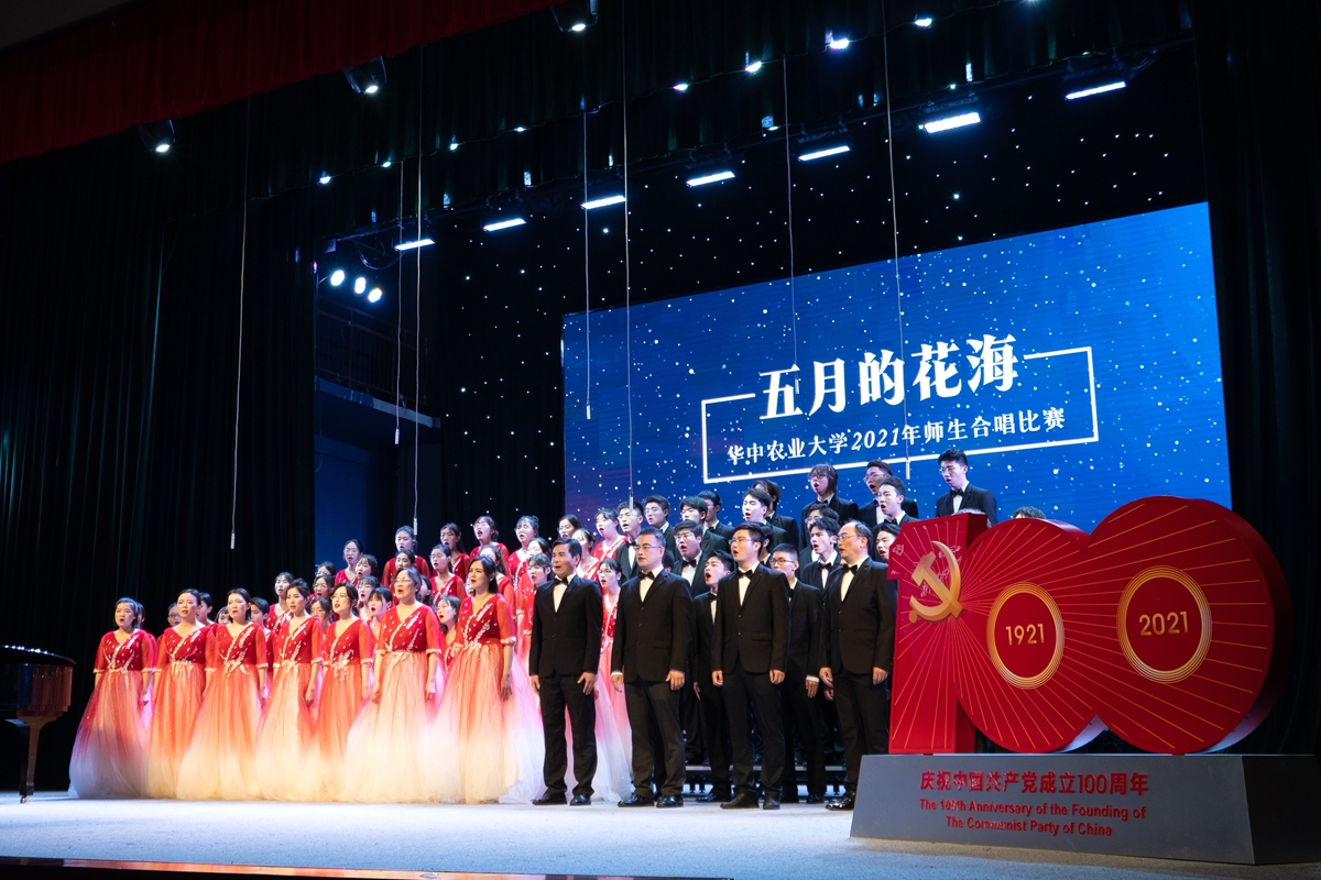 在随后进行的“五月的花海”师生合唱比赛上,来自14个学院的合唱团和我校大学生艺术团小宇宙合唱团在新民主主义革命时期、社会主义革命和建设时期、改革开放和现代化建设新时期以及中国特色社会主义新时代等四个不同时期的经典旋律中,探寻党的光辉足迹,重温用鲜血、汗水、泪水、勇气、智慧和力量写就的百年历史,用青春的歌声表达青年学子对党对国家的深沉爱意。