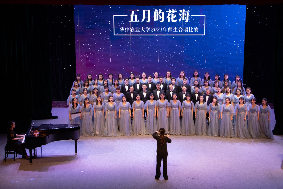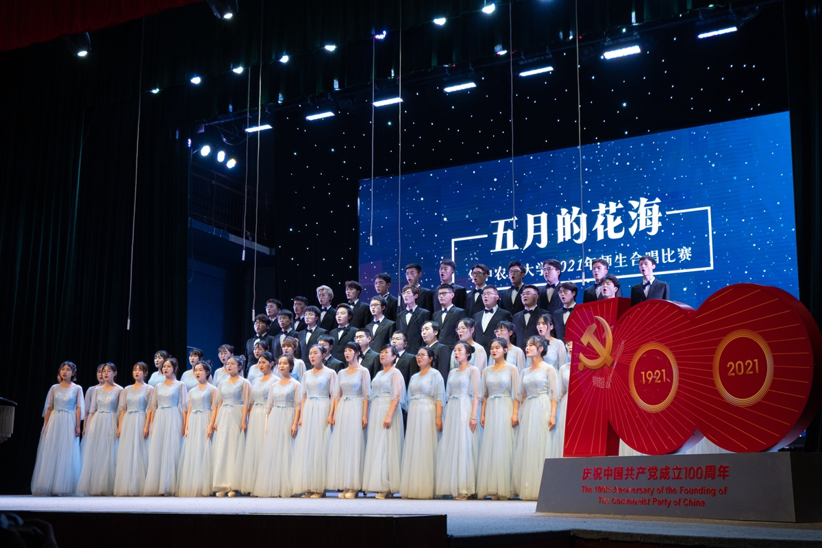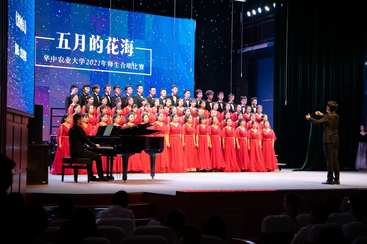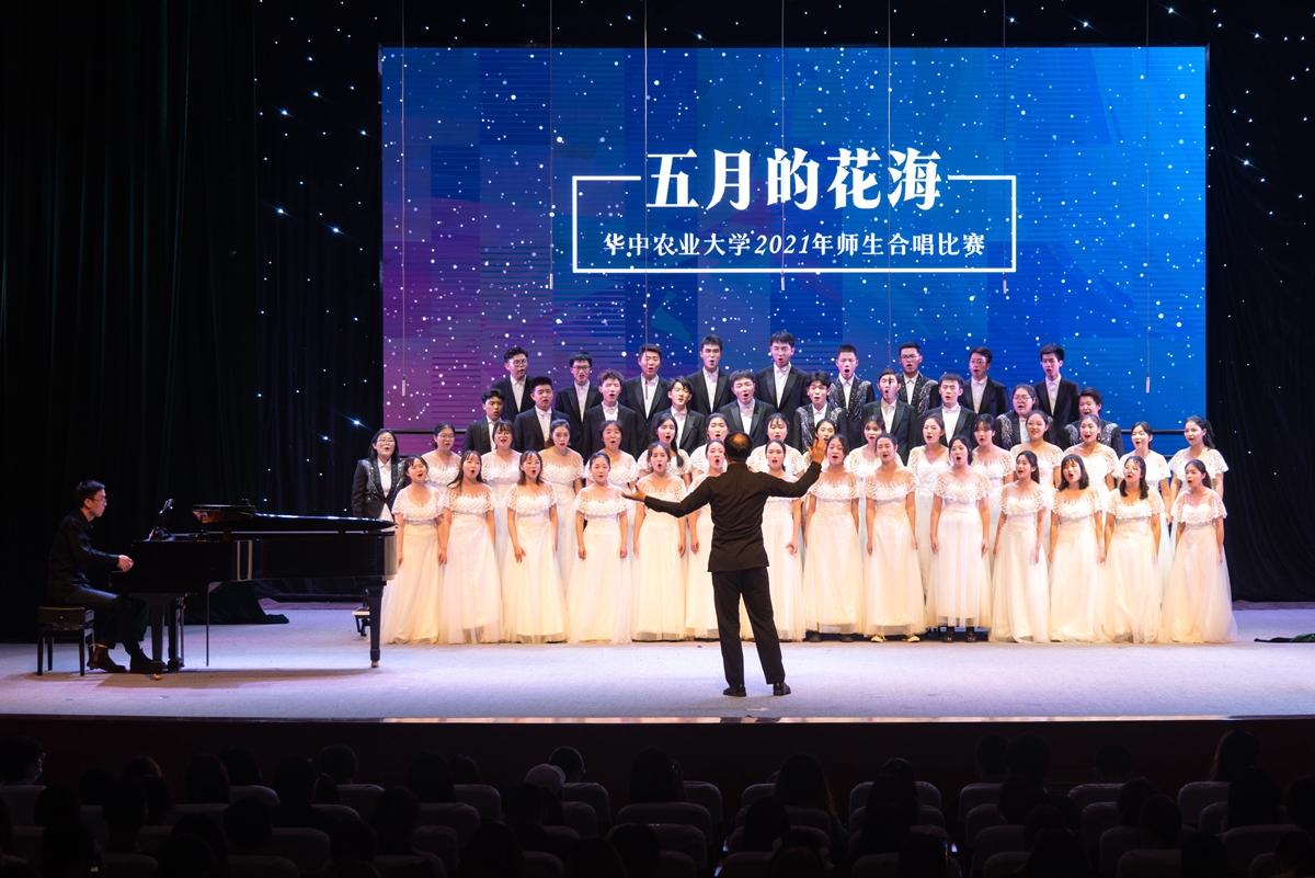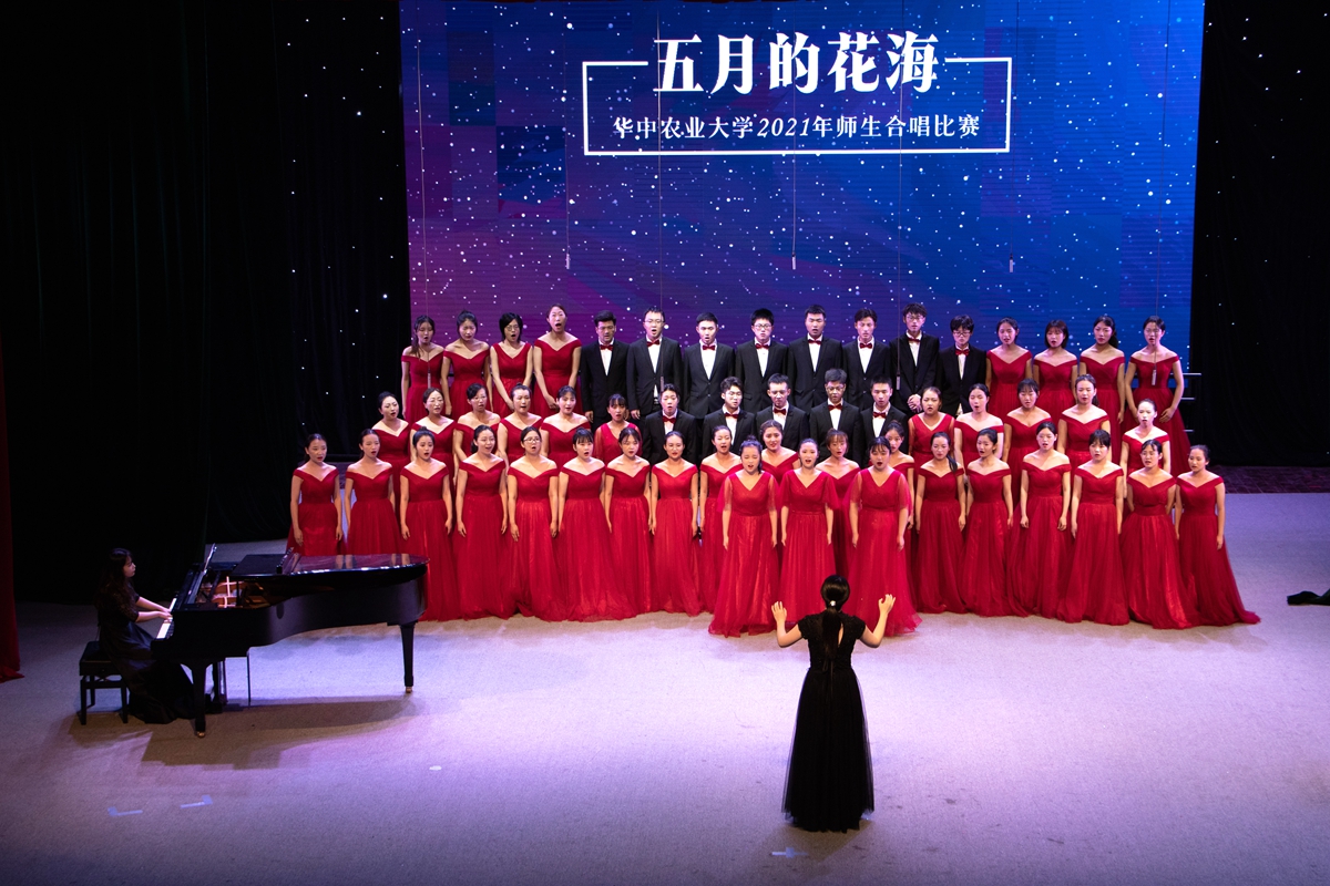 在随后进行的“五月的花海”师生合唱比赛上,来自14个学院的合唱团和我校大学生艺术团小宇宙合唱团在新民主主义革命时期、社会主义革命和建设时期、改革开放和现代化建设新时期以及中国特色社会主义新时代等四个不同时期的经典旋律中,探寻党的光辉足迹,重温用鲜血、汗水、泪水、勇气、智慧和力量写就的百年历史,用青春的歌声表达青年学子对党对国家的深沉爱意。