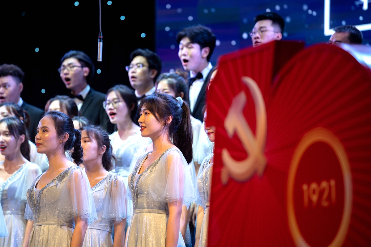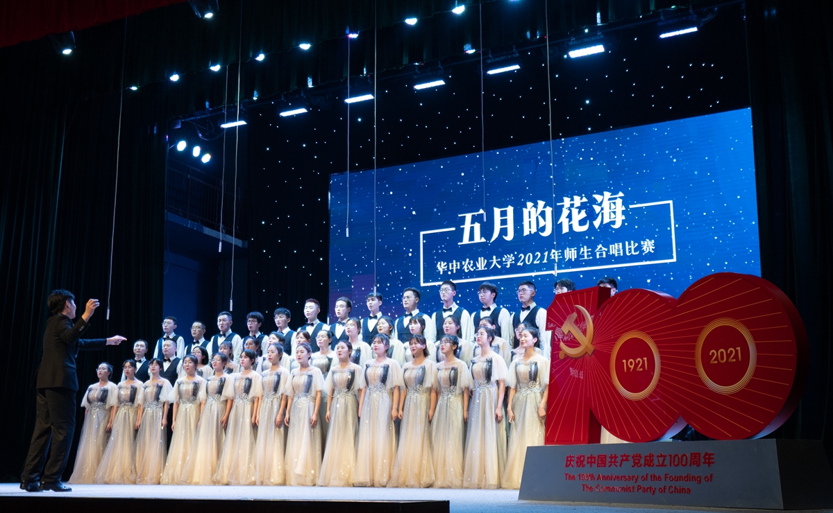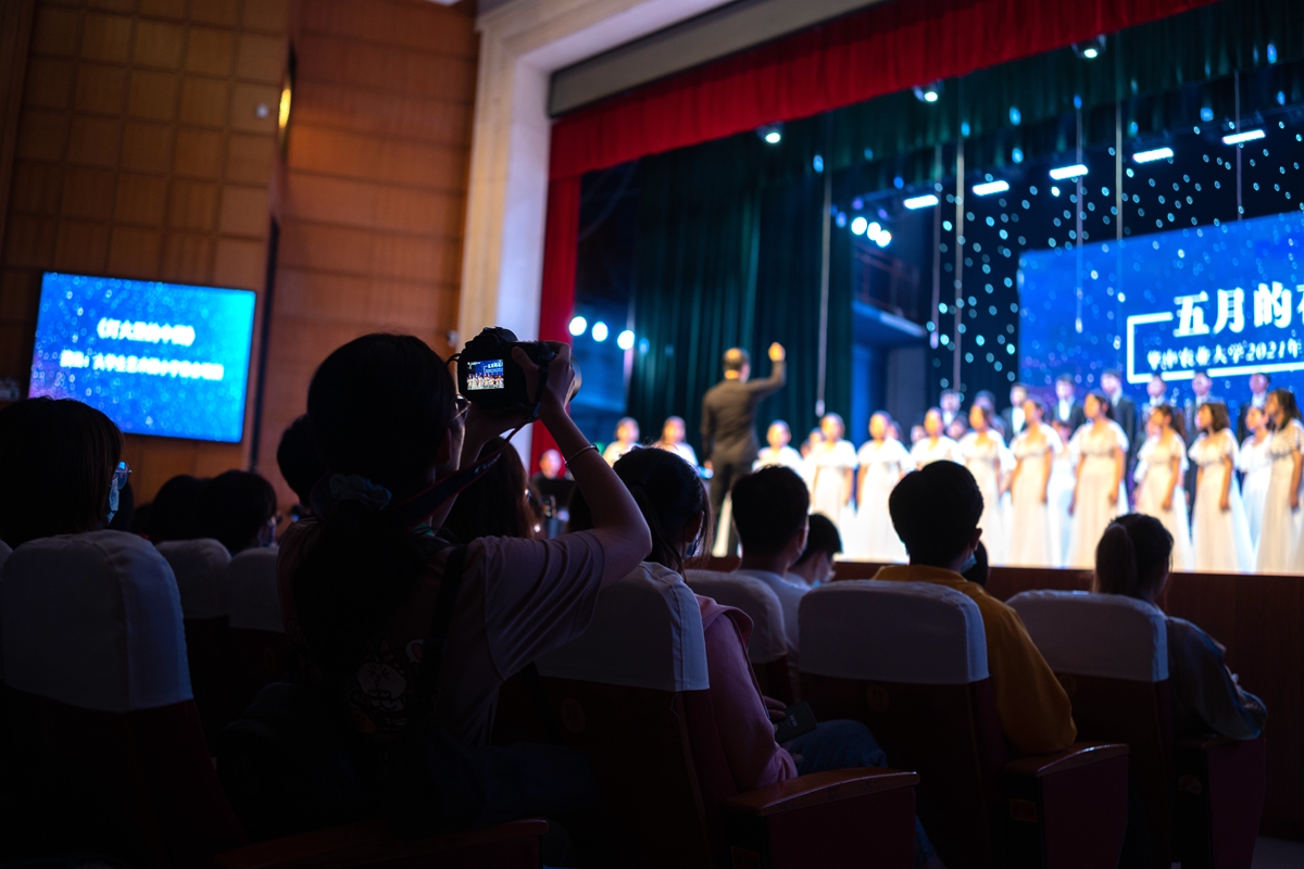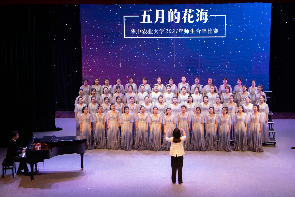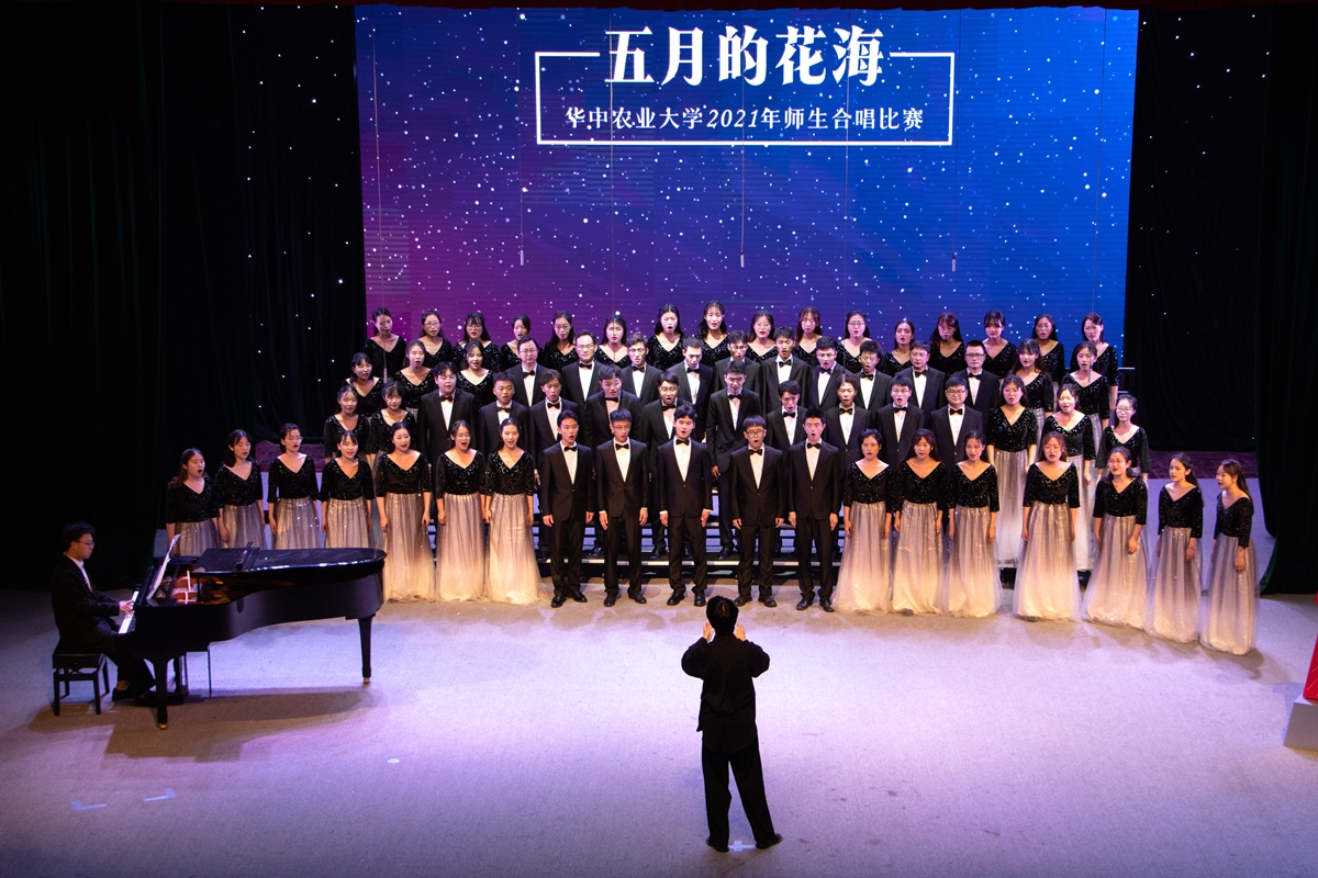 在随后进行的“五月的花海”师生合唱比赛上,来自14个学院的合唱团和我校大学生艺术团小宇宙合唱团在新民主主义革命时期、社会主义革命和建设时期、改革开放和现代化建设新时期以及中国特色社会主义新时代等四个不同时期的经典旋律中,探寻党的光辉足迹,重温用鲜血、汗水、泪水、勇气、智慧和力量写就的百年历史,用青春的歌声表达青年学子对党对国家的深沉爱意。