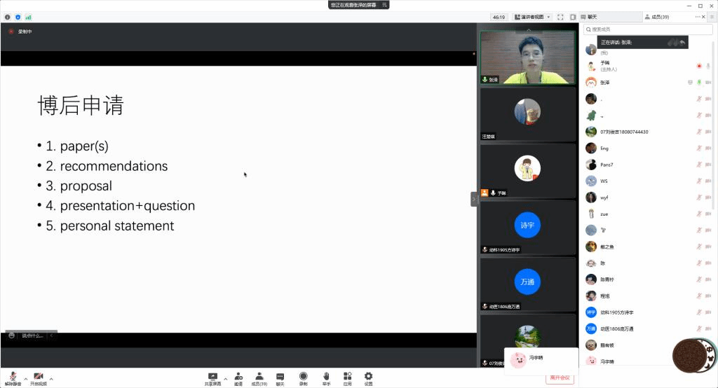 张泽的分享交流立足自身实际,在与会同学中引起热烈反响。与会同学们对张泽的分享交流表示衷心感谢,并就“科研与英国365之间的关系”“申请北生所研究生的面试流程与北生所的科研环境”“如何选择适合自己的博后位置”等问题与张泽展开长时间的积极互动。张泽表示,希望同学们都能有所收获,学有所成,在各自擅长的领域发光发热,为我国的科学研究奉献青春、贡献力量。