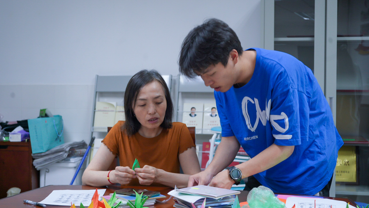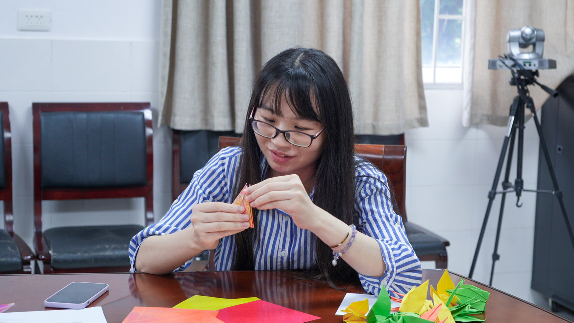 毕业年级辅导员程唐煜一边制作着纸鹤一边说:“纸鹤寓意着展翅高飞,祝愿毕业生们都能够不坠青云之志,不负年少芳华。”
