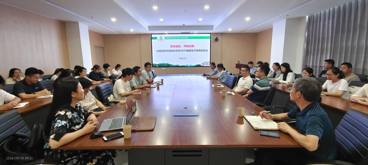 (记者:曹慧媛 汪楚琪 摄影:曹慧媛)9月5日上午,动科动医学院动物营养与饲料科学系在四综D209会议室举行2024级研究生新生导师见面会。参加会议的导师有彭健教授、齐德生教授、孙铝辉教授、魏宏逵副教授、许庆彪副研究员、王帅副研究员、高思老师及学系全体2024级研究生新生。会议由齐智利副教授主持。此次见面会旨在帮助研究生新生尽快适应研究生生活,明确研究方向,搭建师生沟通交流的平台,共同规划未来学习与科研之路。