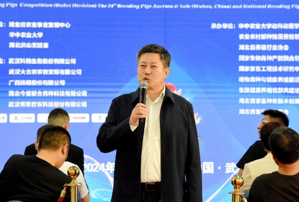 湖北省农业事业发展中心党组成员、副主任易俊东宣布第24届中国武汉种猪拍卖会正式开拍。